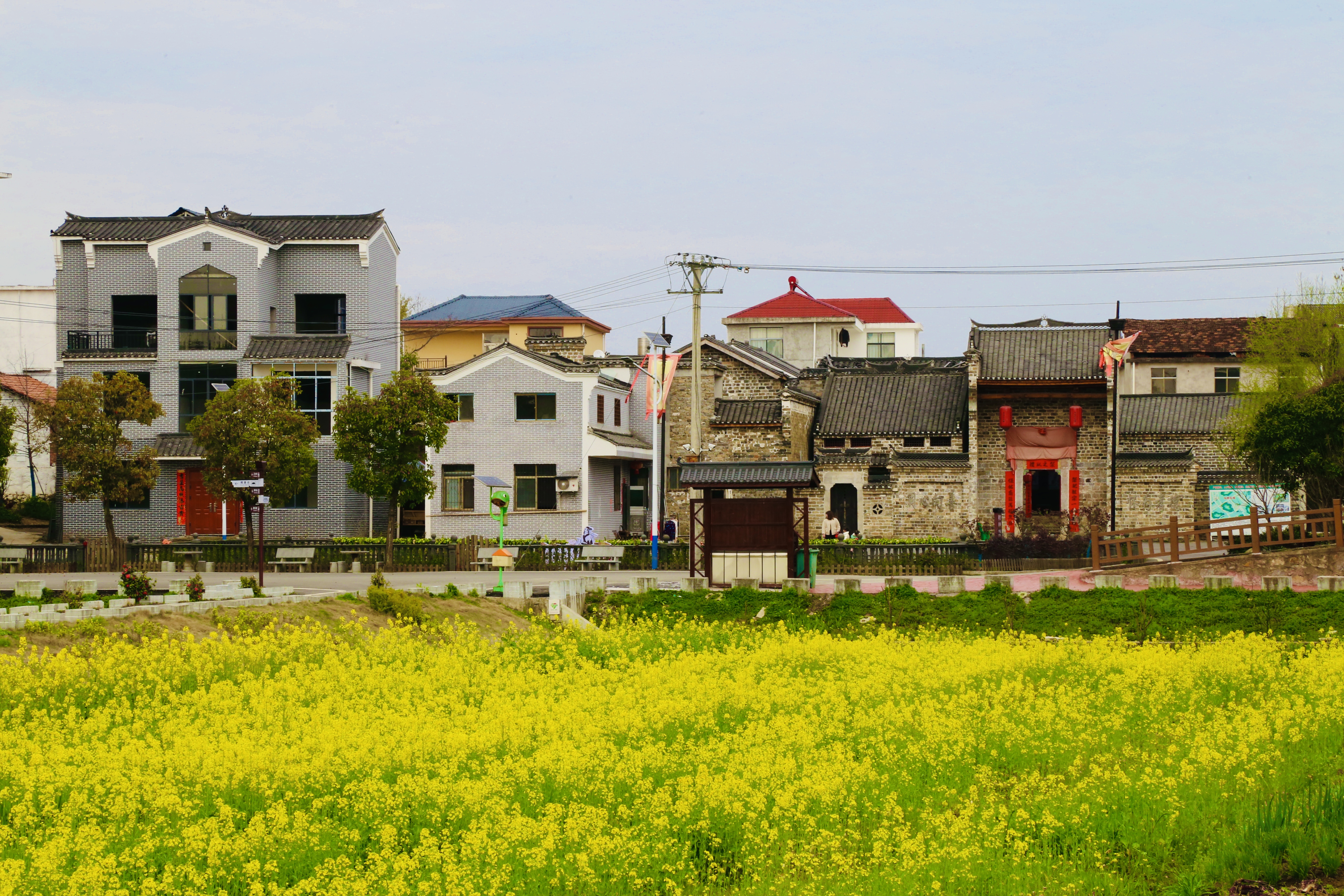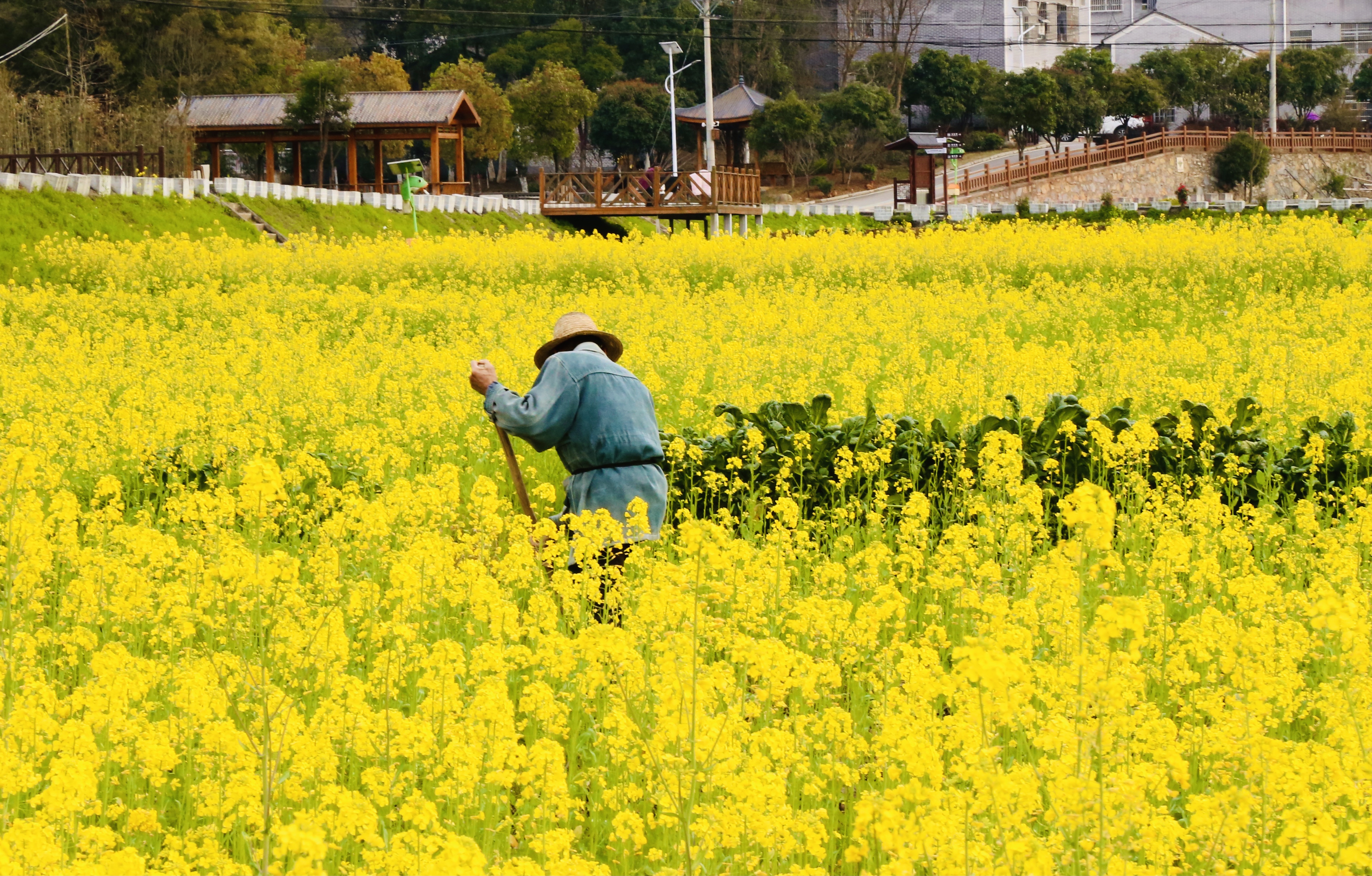 又一片绝美油菜花海被我们发现,这片油菜花海有6000多亩,白墙黛瓦,屋舍俨然,田园民居错落有致;多彩原野,良田美池,木栅庭院相映成趣、“趣乐园”,甚至还“开”来了绿皮火车……田屋映衬、道路平旷,一幅家和村美的迷人画卷舒展开来。