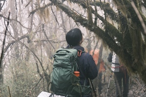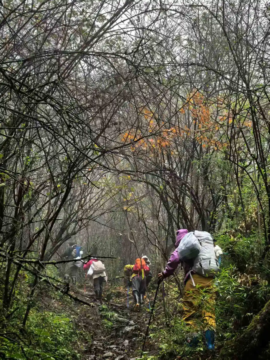 13:30:整理好装备,开始徒步,进入原始森林,一路上的腐叶枯树,大树藤蔓,还伴着峡谷溪水穿梭至山脊,一路高山草甸,箭竹丛林到达营地。
