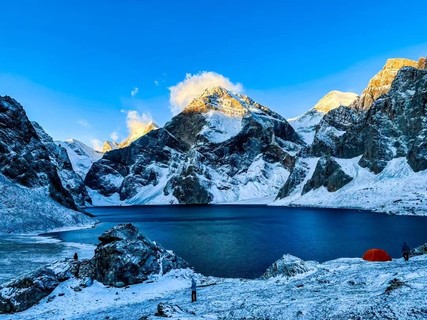早晨起床后修整,清晨的天堂湖静谧而灿烂,第一缕阳光映射在峰顶,在巍蔚壮蓝的湖水映衬下犹如仙界;中午出发,沿阿克布拉克河谷开始下行,这里是深山牧场,零星牛羊点缀在河谷中。途中需要过河7-8次,一路不断下降。下午抵达阔克苏河营地后扎营。
