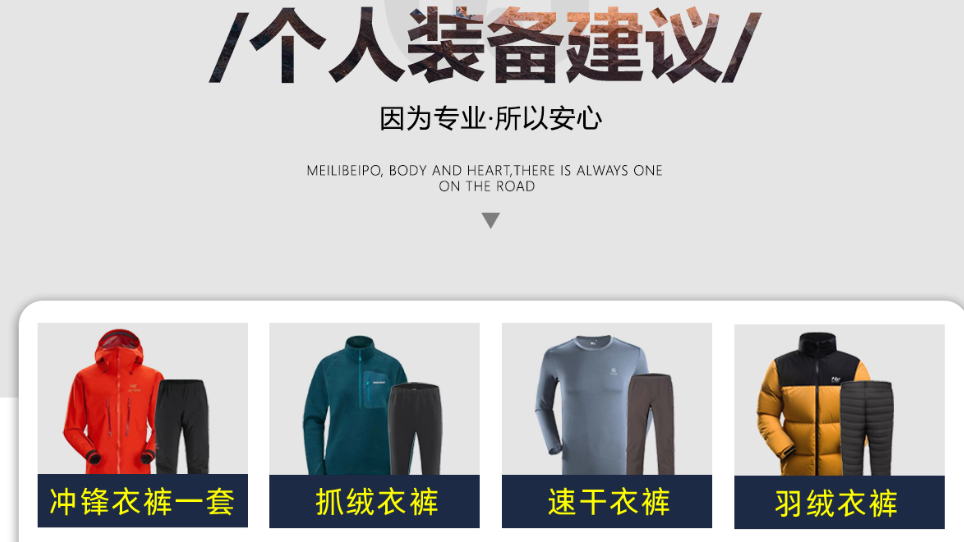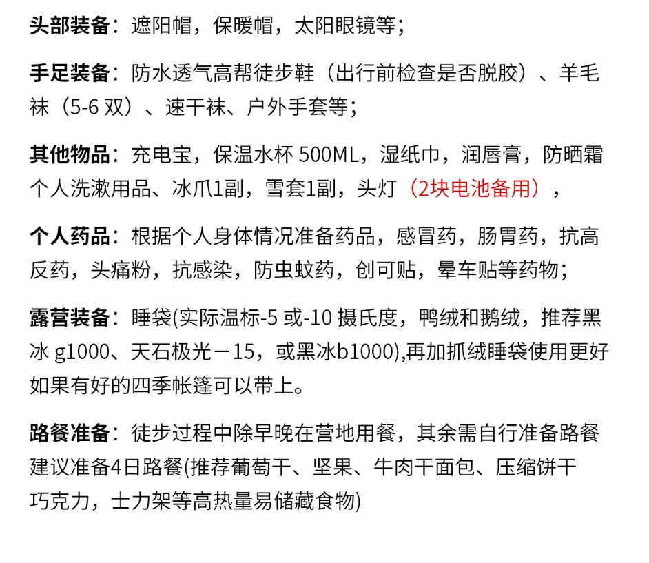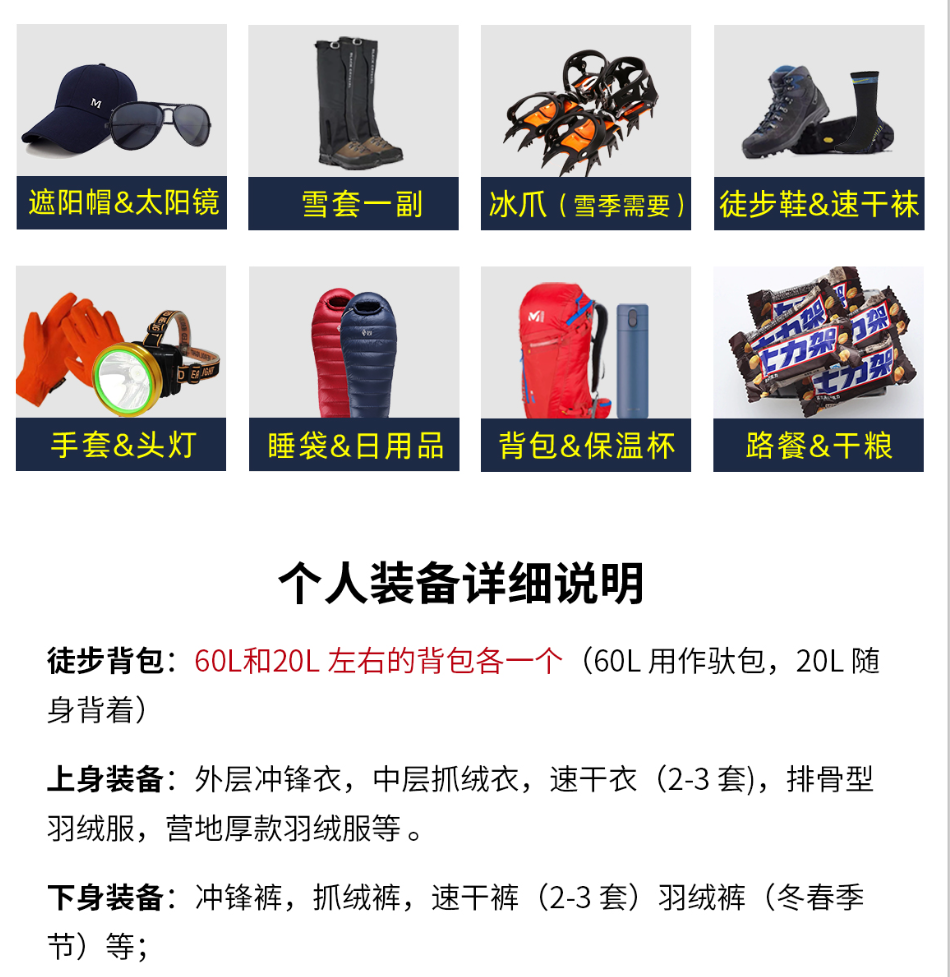 装备参考:60L左右登山包(带防雨罩)、28随身包、睡袋(根据季节温度选择)、冲锋衣裤、软壳衣裤、排汗速干衣裤、防水登山鞋、保暖衣物(棉服或者羽绒,根据季节温度选择厚度)、徒步袜(多双)、头灯、保温杯、餐具、帽子、手套、太阳镜、防晒霜、雪套(季节性需求)、常用药品、个人随身物品及证件等。