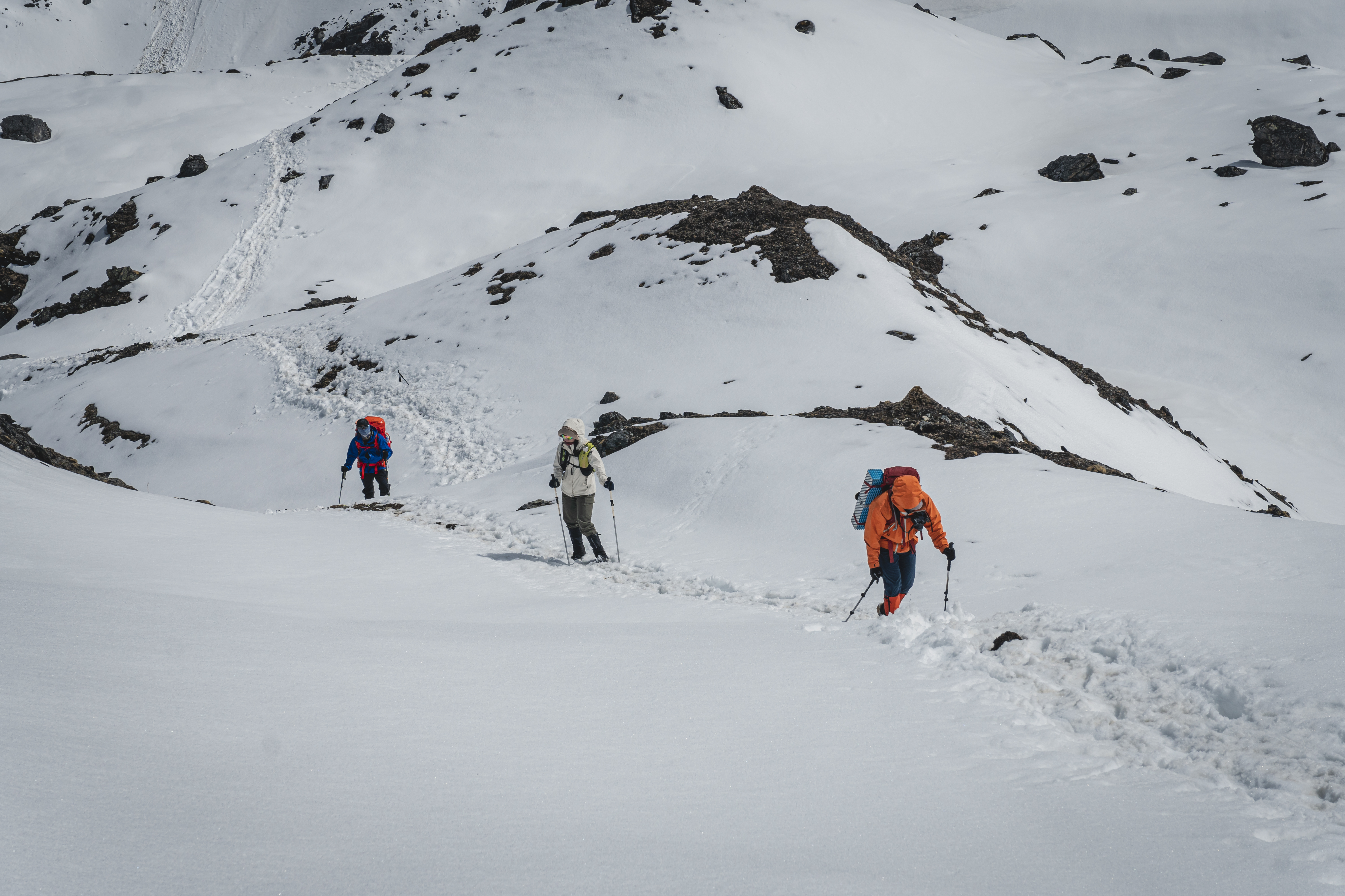 早上吃过早餐,向西藏前进,5200的滇藏界垭口是全程最大的难点,不止是海拔高度,还有路况艰险,垭口两侧都没有明显路迹,行走要格外小心。一路爬升到达海拔4700m平台,稍作休息后继续爬升。随着海拔升高,措格腊卡逐渐露出视野,奶日顶卡冰川也再一次完全展现眼前。在垭口上可以一览梅里北坡风景,措格腊卡也尽显眼前。垭口的另一侧便是西藏界,放眼望去,可看到西藏的木孔雪山。沿山脊向前,行走不远便可看到双湖。休息片刻,之后原路返回坡将牧场,大约2小时左右回到营地。