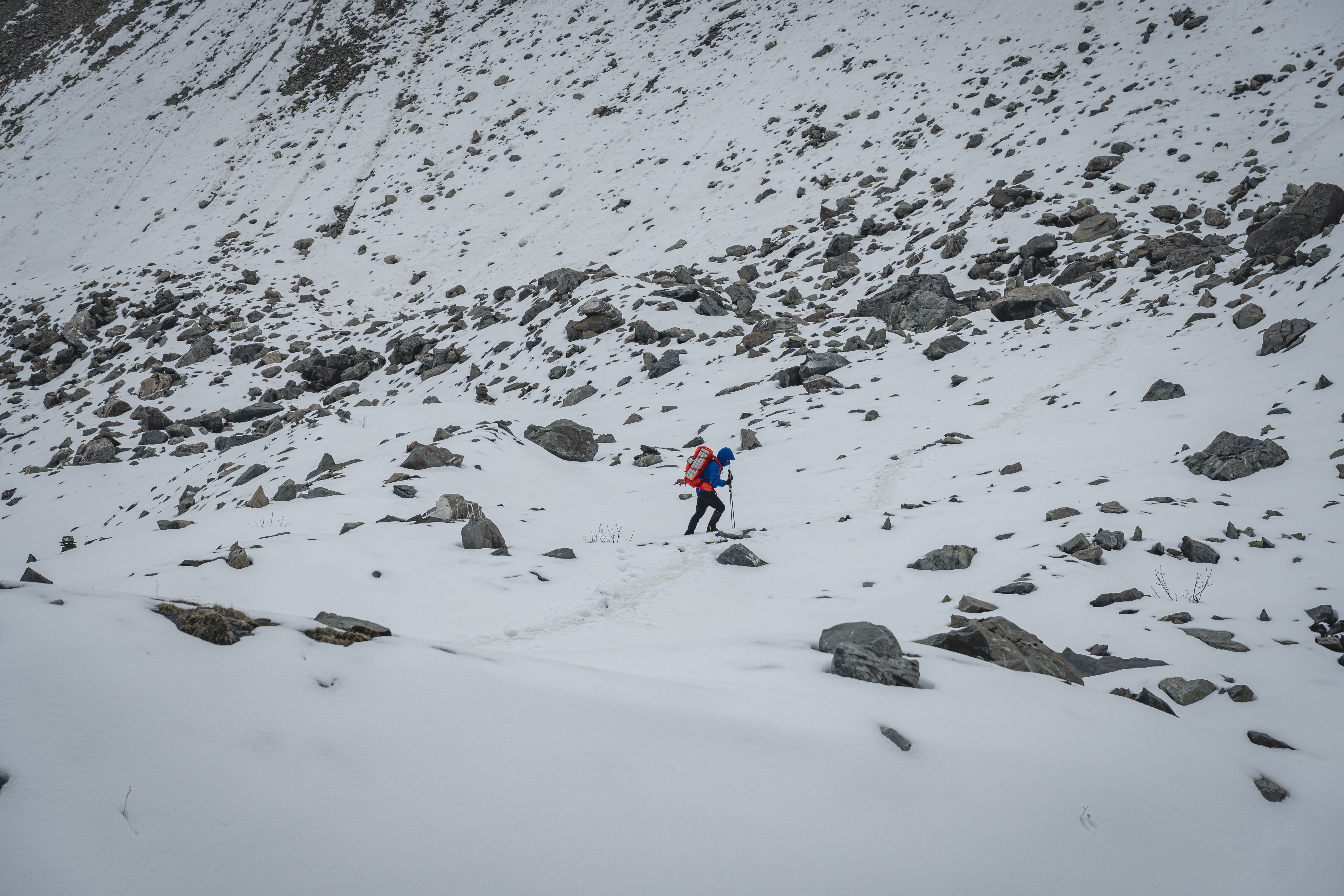 早上天气好可以拍摄梅里北坡日照金山。早餐后出发,离开营地通过一个小牧场后开始爬垭口。先经过一段很陡的碎石坡,之后继续沿山体爬升,到达4500米的冰川谷遗迹腹地,绕过面前的侧碛垄,继续向上,到达次丁垭口——本次行程的难点之一。一路都可观赏到梅里北坡及冰川,途中可以多个角度拍摄冰川。垭口之后是垂直下坡,下降500多米,到达谷底,便是坡将营地。营地海拔4200米,身后便是滇藏交界的5200垭口。