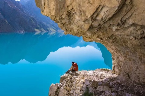 湛蓝幽静的天堂湖——阿克库勒湖,是乌孙古道徒步的标志。位于天堂湖侧边悬崖的马道,完全是由人工开凿而出,行走其中,人与湖光山色融为一体,甚是美哉!其中的老虎口更是每个来往此处的山友,必然打卡之地。