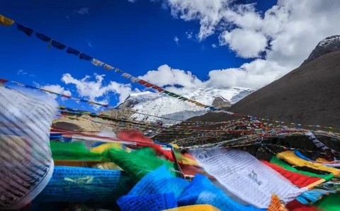 乃钦康桑雪山是西藏四大神山之一,由于高寒,山体顶部尖锥突兀,常年终日白云缭绕,飘撒粒雪,终年累积、压实,形成了厚达20—100米的冰层,冰层受本身重力影响,缓慢移动发育成了多条冰川。卡若拉冰川就在乃钦康桑雪山下,雪白的冰川如一副巨型唐卡挂在山壁上,在阳光的照耀下熠熠生辉。