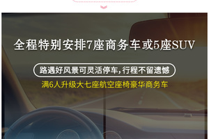 5. 全程7座商务车或5座SUV【不指定车型,以实际安排为准】。7座商务车每车默认6人,SUV每车默认4人;(关于5人、3人小团体要求独立成团,请补差单独走)。