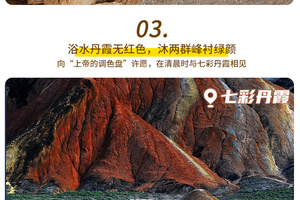 1.张掖七彩丹霞的游览顺序比较复杂,我们会在进入景区之前给大家发游玩攻略,在景区也内会有标示。在丹霞地貌大家先去二号点观景台,一号和五号观景点会有一些别致的形状,可以近距离观看其细节。最后去最佳拍摄点的四号观景台,观景台背后有一座吊桥,过桥之后还有一个云端观景台,云端观景台是面南背北的,可以看到整个七彩丹霞的全景,从高处俯视如同航拍一样,气势无与伦比。还可以走到北面,拍摄临泽县的白杨林和村落。景区新开放的五号观景点,相对更加壮阔,今天我们的住宿靠近七彩丹霞景区,步行即可到达。