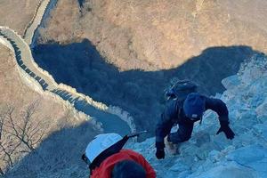 天梯是一段70度陡坡、70-80米长的长城,最窄处60公分宽,台阶40-50公分高、15公分台面,要四肢并用地爬;
