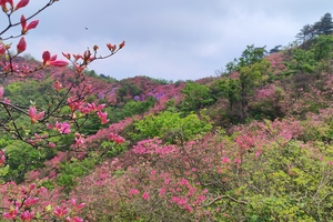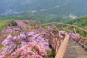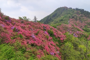天马寨位于湖北省黄冈市英山县雷家店镇境内。“天工斗巧乃如此,令人一步千徘徊”,山上虽然都是杜鹃,但花期前后不一。顺序是从山底下一直往半山腰到山顶依次盛开。那些开过的花,零落萎地,形成花山花径;盛开的花,千花怒放,组成仙山花海。更有含苞的骨朵,含羞待发。正是:“繁枝容易纷纷落,嫩蕊商量细细开”。天马寨杜鹃,全部原生态,没有一花一株是人工移植。且天马寨杜鹃,因其地理位置、自然气候不同,大量紫杜鹃与红杜鹃共生共荣,互相媲美,这一特色在一般地区难得一见。当然,天马寨花海,不光有五彩杜鹃花海,还有野樱花花海、桐花花海。这各种花海在整个春天,涌动一拨又一拨花潮,让天马寨这匹宝马,长期披上五彩花衣,激情豪迈地奔驰在大别山山脉上。