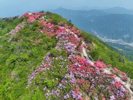 四月是天马寨最美丽的季节,五彩杜鹃沿着最高海拔接近1100米的高度梯次盛开。尤其是进入下旬,盛开的杜鹃开遍整个山脉的大小山脊,让荡漾翠绿的群山披上绵延十里的“五彩丝带”,蔚为壮观。