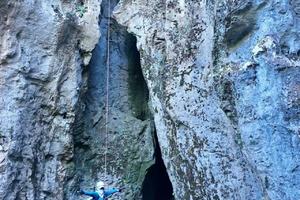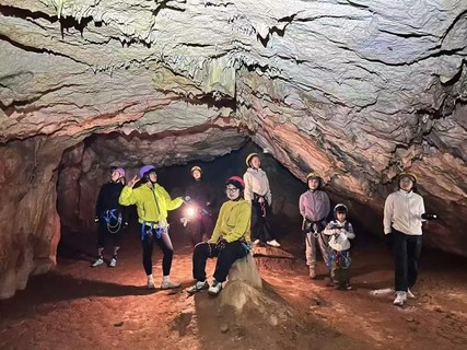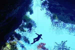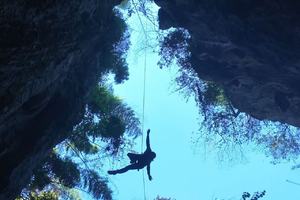 但我们这次要去的是藏在深山里密林中的一个天坑,进行岩降,大约高度50米左右,可一绳到底悬空降落,中途还可以摆几个POS,拍几张剪影。旁边还有一个溶洞,洞不太深,不需要绳索,探秘未知,欣赏溶洞美景,可以打卡怕照,