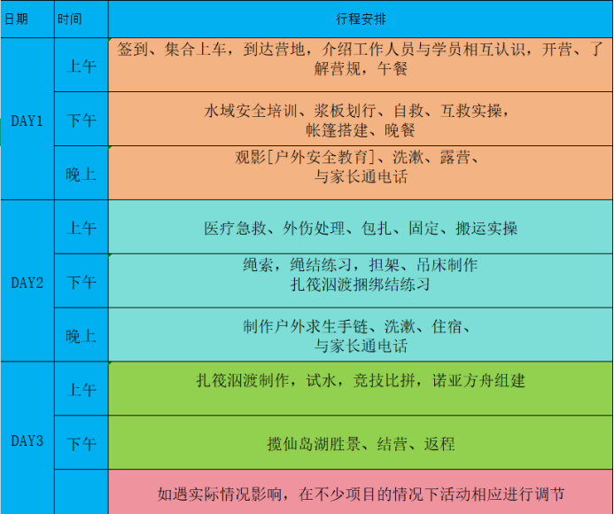 本营安排项目,桨板自救互救、扎筏泅渡、医疗救护(包扎)、露营帐篷搭建、绳索绳结运用制作吊床和担架,自制求生手链等活动