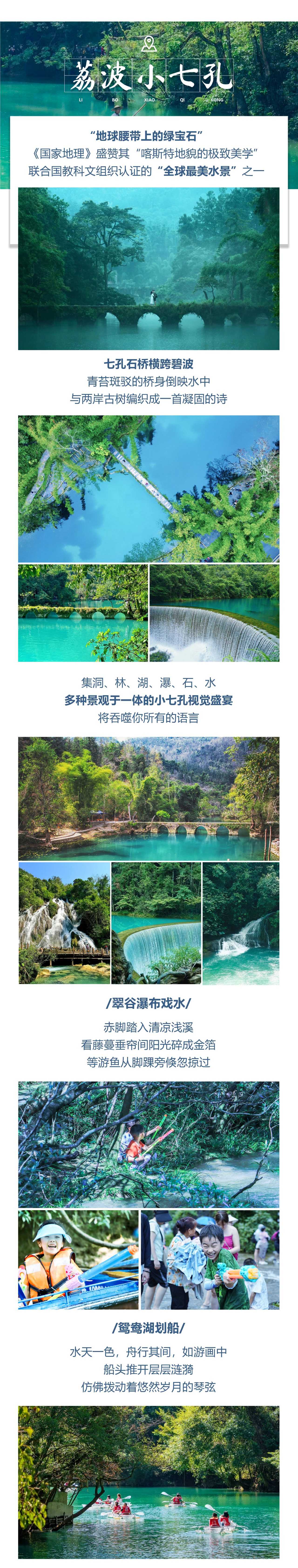早餐后,我们出发前往【荔波小七孔】,荔波位于贵州与广西的交界处,小七孔更是被称为地球上的绿宝石,我们从东门进入小七孔景区,穿过清朝时期修建的小七孔桥,步行于这“抬头张家界,低头九寨沟”的自然风光,步行于走道上,水花溅落在四周,感受【68级跌水瀑布】和【拉雅瀑布】的壮观,我们戏水踏步于“水上有石,石上有树,树植水中”的【水上森林】,归隐于卧龙潭瀑布。