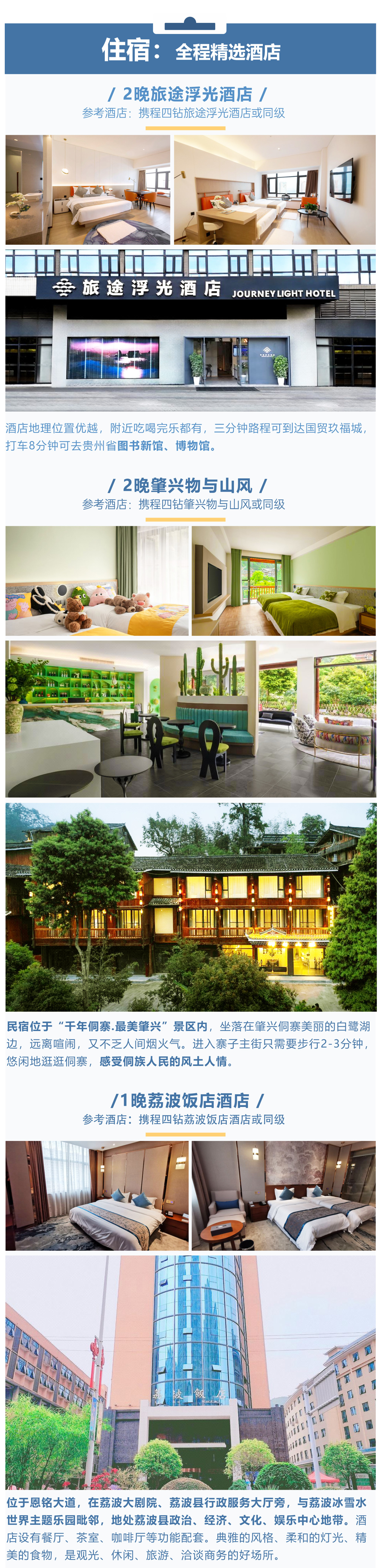 【住宿】贵阳旅途浮光酒店或同级2晚,肇兴精品民宿2晚,荔波饭店酒店或同级1晚,