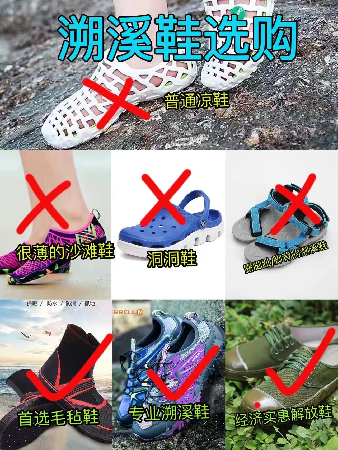 4、溯溪鞋或者解放鞋或者防滑平底运动鞋(若只有一般球鞋旅游鞋请自备一双大号厚棉袜套在鞋子上防滑)