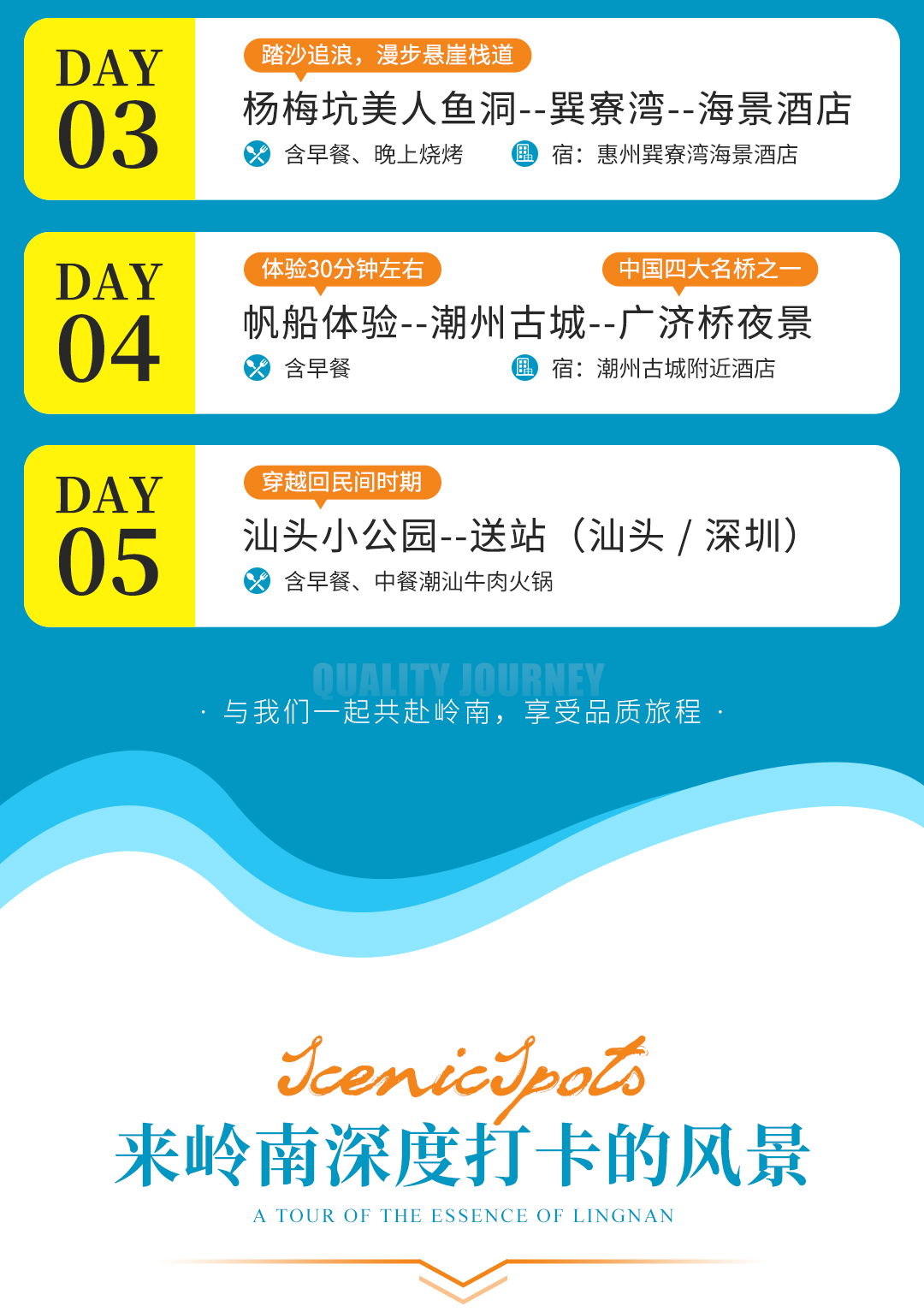 3)餐费:全程4个早餐,D3赠送一晚海边烧烤BBQ,D5赠送一顿正宗潮汕牛肉火锅;
