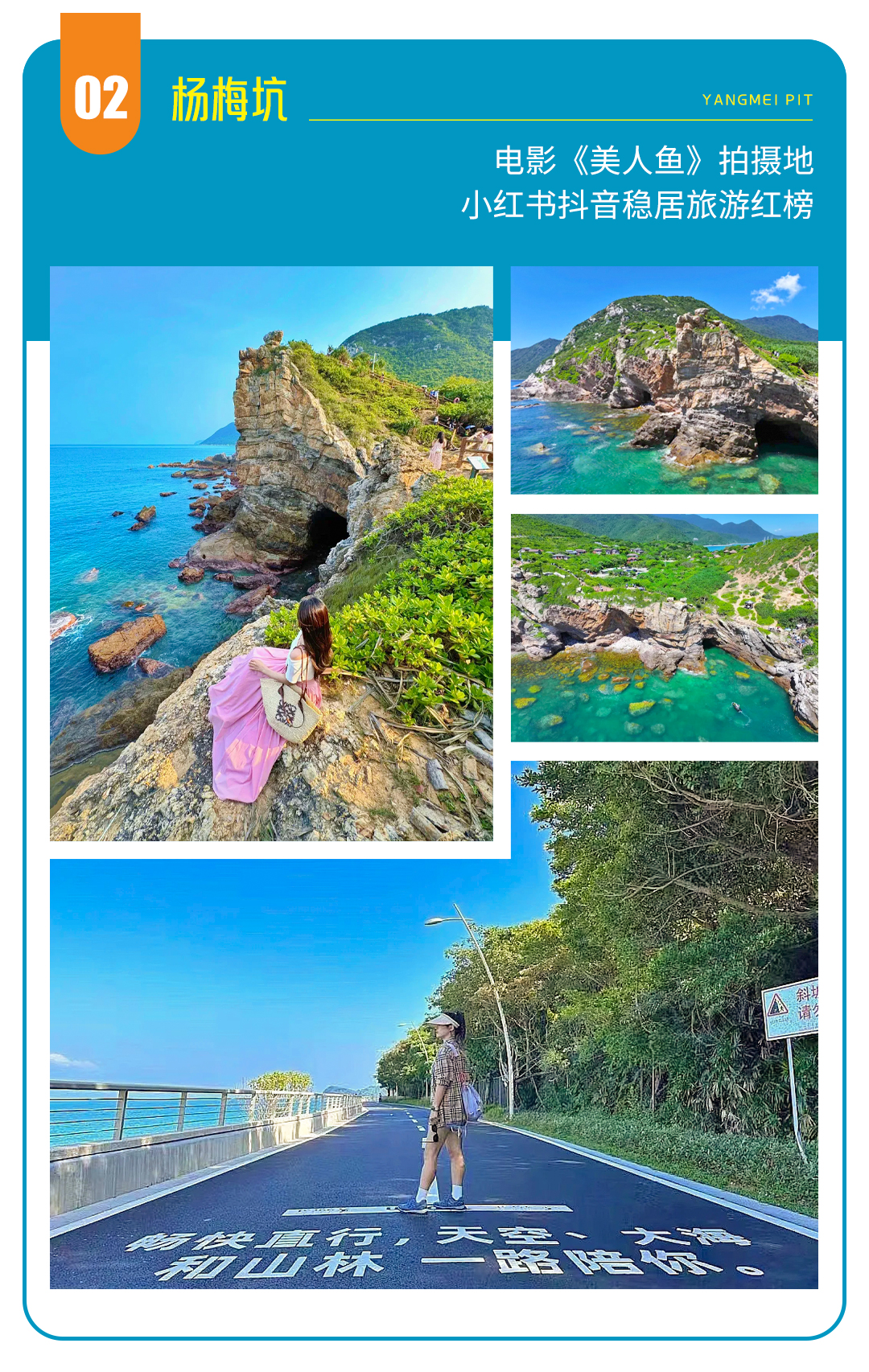 早晨起床早餐,随后前往杨梅坑。没错,电影《美人鱼》就曾这里取景,被美上热搜。充满梦幻色彩的地方,近5公里的鹿嘴步道。眼前一半是山,一半是海,走到碧道尽头,可以在沙滩踏沙追浪,或漫步悬崖栈道,探访神秘美人鱼洞;