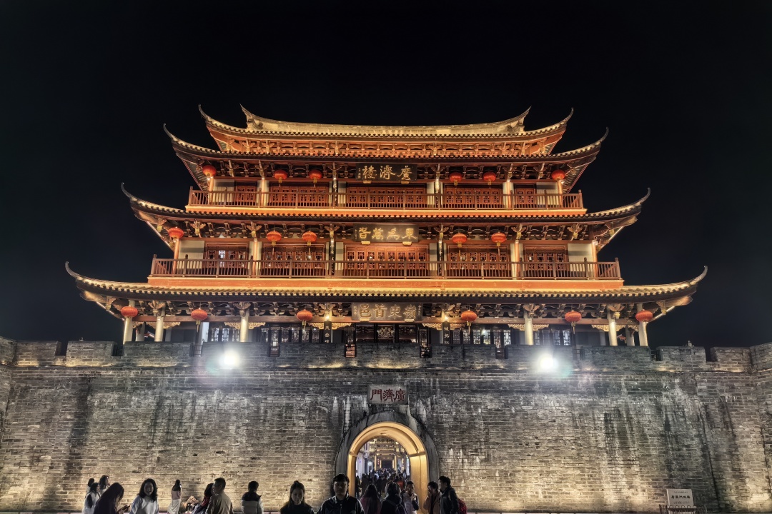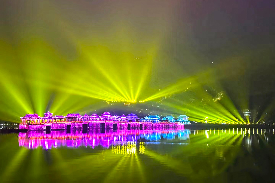 晚上欣赏广济桥灯光秀,水墨乡愁丹青韵味,桥身流淌起七彩光影。