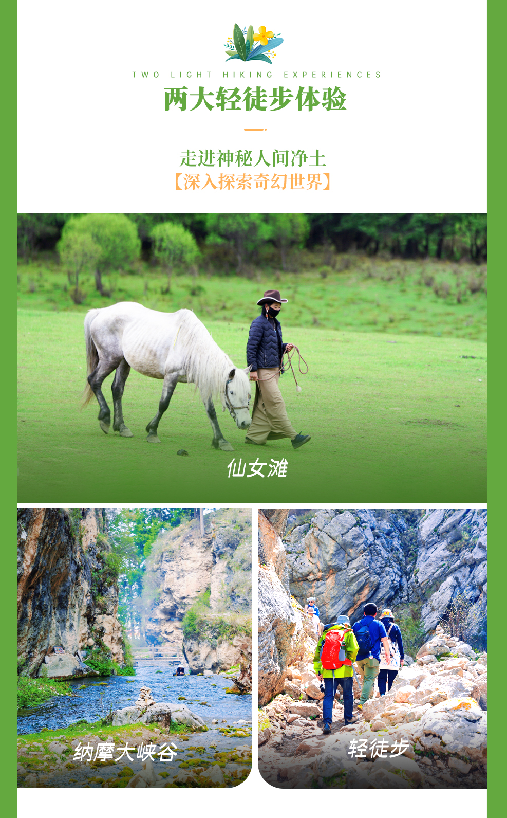 在群山环绕之中,有一处大片的草坪,平整的木栈道,那就是【仙女滩】在这里可以一览无余的饱览整个扎尕那山峰的全景。在这里漫步,野花在草场上竞相绽放,只为一睹扎尕那的美丽。除了观景台观景,有时间体力兴趣还有徒步穿越线路,也可以观光车+徒步+骑马等方式(费用需自理)