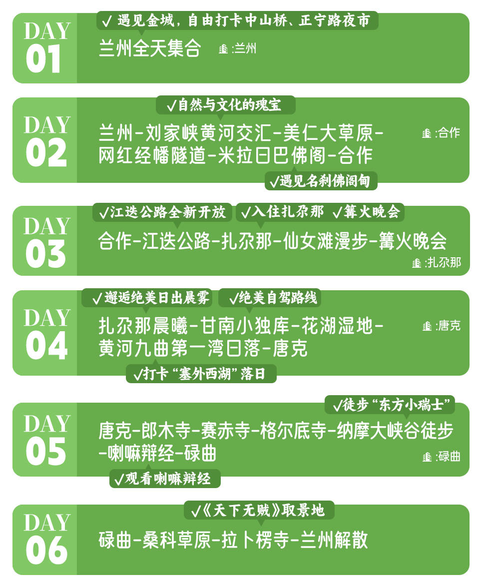 3、行程结束当天17:00左右抵达兰州西站,大家可以依据自己的时间,自行选择继续游玩或是启程回家。火车建议购买19:00以后的车次,高铁建议购买18:00以后的车次,飞机建议购买20:30以后的航班。兰州火车站距离兰州中川机场约68公里,车程约1.5小时。兰州站距离机场大巴客运中心站徒步300米,到达机场71公里,用时1小时25分钟左右,大家根据自己的航班车次选择返程票。