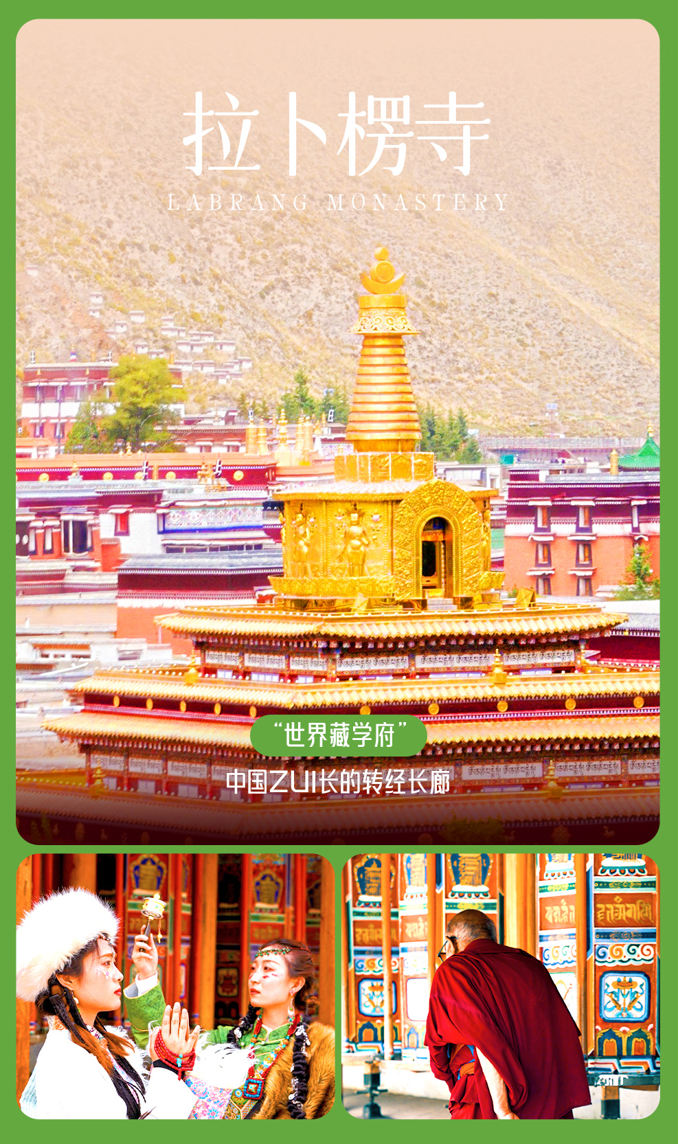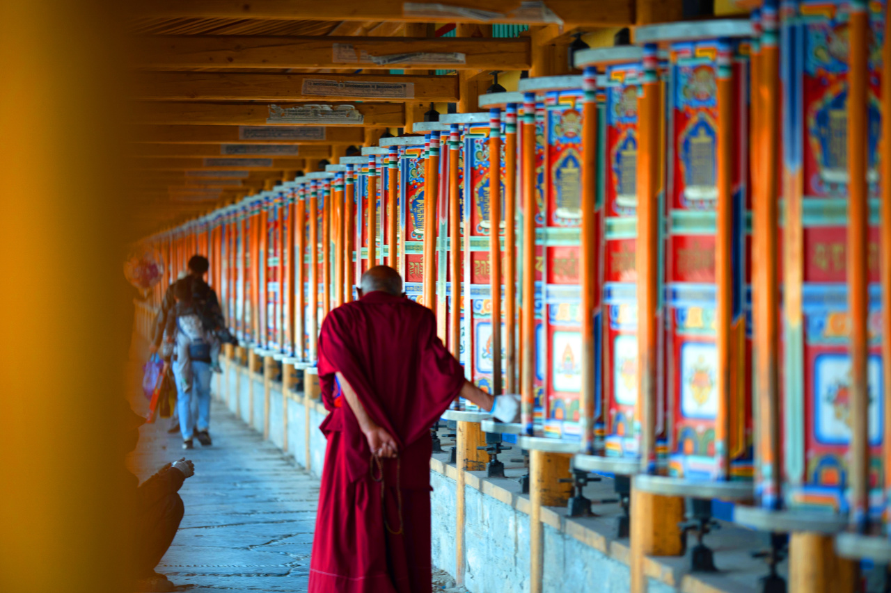 寺院规模宏大,这里有恢宏的寺院建筑群,供奉着无数的巨大佛像和各种精美的雕塑、壁画、法器等。拉卜楞寺超长的转经长廊是全世界罕见的,共2000余个转经筒,转遍每个转经筒至少需一个小时。一般游览拉卜楞寺的方式都是顺时针绕寺一圈,这也是藏传佛教的朝圣仪式。在拉卜楞寺西南角有座古老的木桥,横跨夏河,过桥上山,站在晒佛台上能将拉卜楞寺的全景尽收眼底。带给他的信徒以平安与圆满。感兴趣的小伙伴可以沿着转经长廊推转经筒,感受藏民文化。