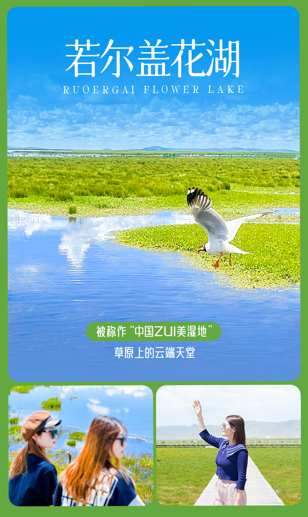 我们途径【若尔盖草原】,一路美景相伴,到达【花湖湿地】(车程100KM 行车约1.6h),花湖位于四川若尔盖和甘肃郎木寺之间的213国道旁,是热尔大坝草原上的一个天然海子。花湖经典的时间是在五六月份,湖畔五彩缤纷,好像云霞委地,而湖中则开满了水妖一样的绚丽花朵,这种植物看起来平淡无奇,在雨水充沛的八月把纯蓝的湖水染成淡淡的藕色,时深时浅,像少女思春时低头的一抹酡红。漫步在木栈道上,湖水透彻的蓝,珍稀飞禽在湖上嬉戏,草原上风云际会,每一刻都是世间绝美的存在。
