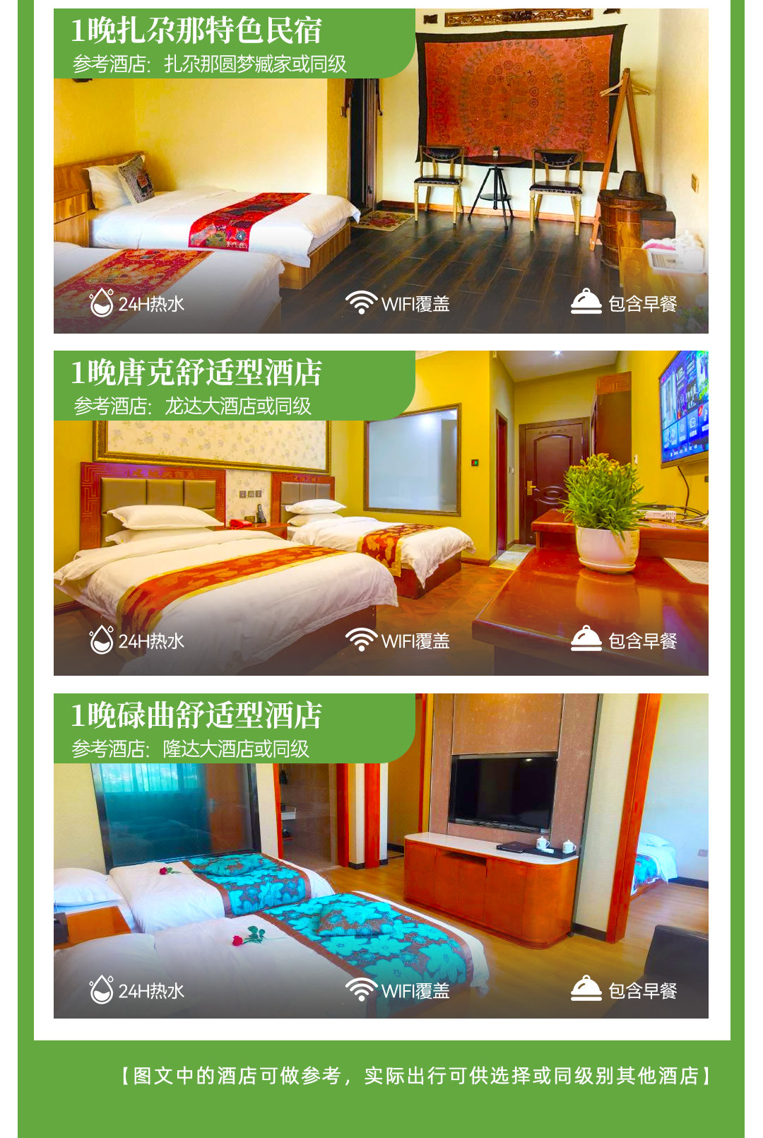 3、 行程中的所列的酒店类型,2星/2钻=经济型;3星/3钻=舒适型;4星/4钻=高档型;5星/5钻=豪华型;意为评定或条件到达相应标准的酒店,少部分地区,由于政策等因素,可能存在酒店条件满足,但未进行星钻评定的情况;