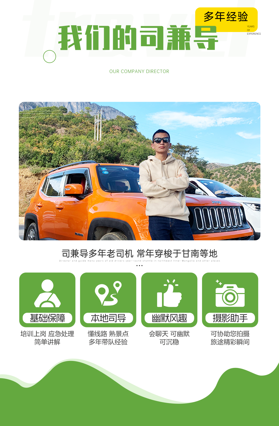 5、司机兼领队(司机仅提供向导、代办住宿等服务;无法像专业领队一样提供讲解、景区伴游等服务!)