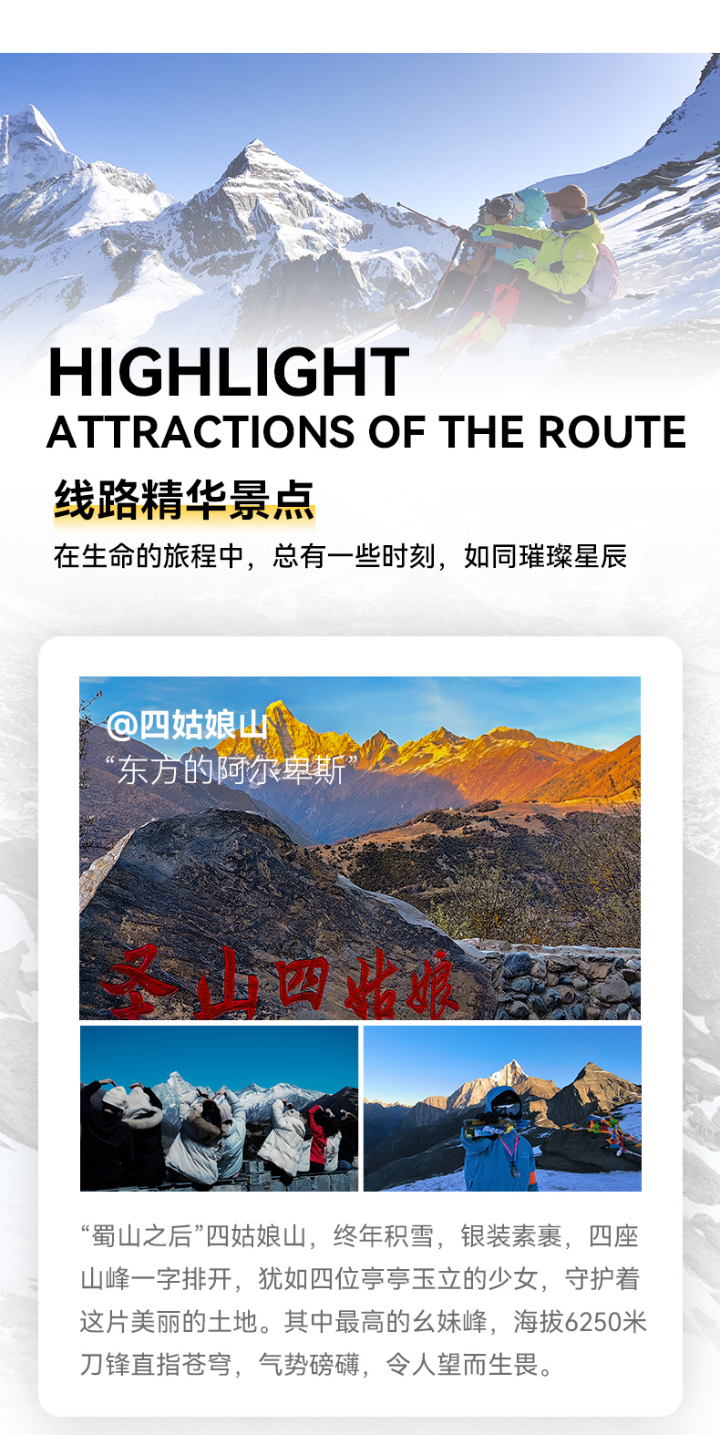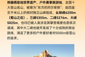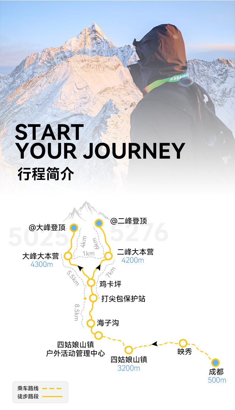 大峰大本营-(徒步约3KM)-登顶5025M-(徒步约16KM)-四姑娘山镇-(乘车约220KM)-成都散团
