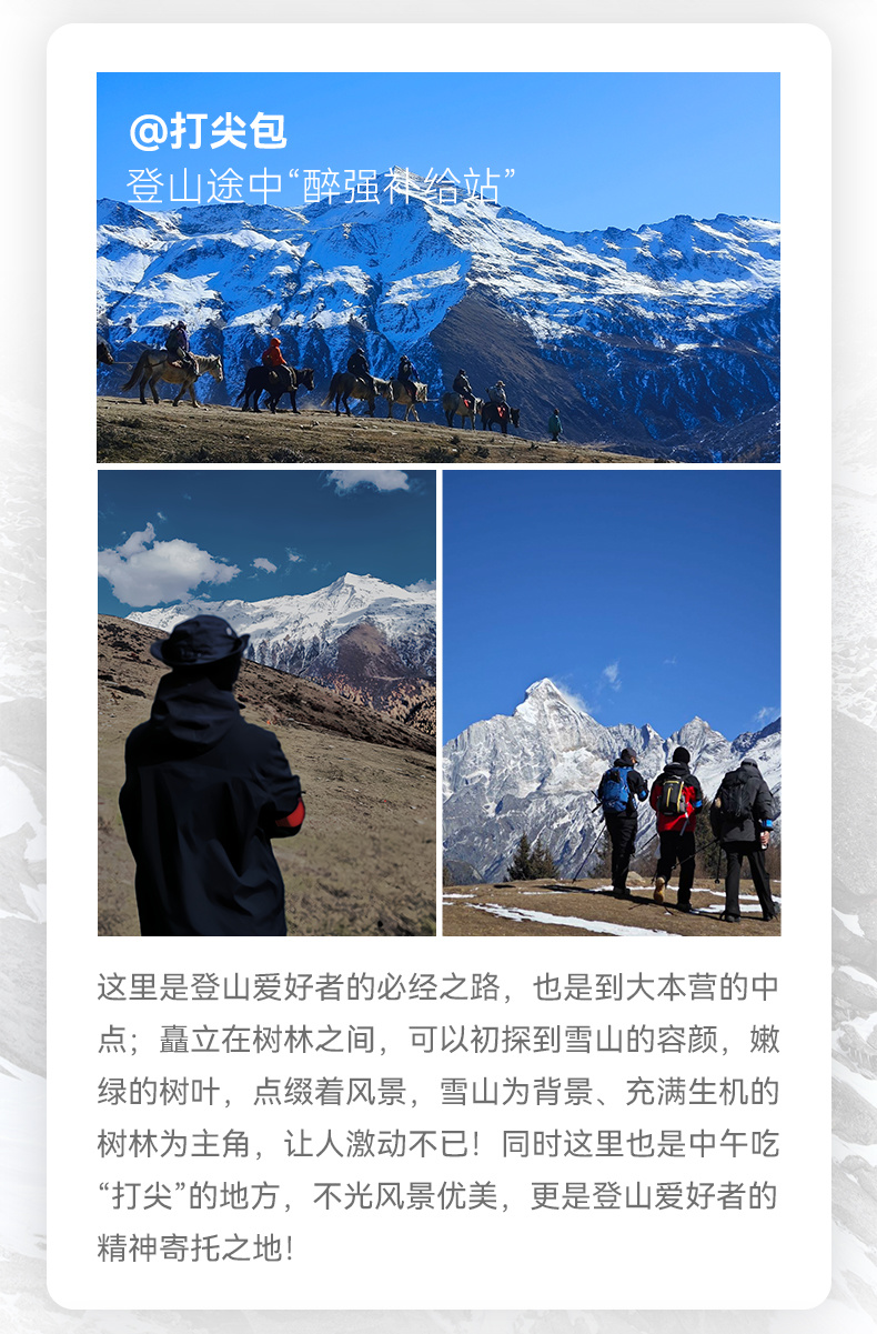 行程概览:户外管理中心早上9点开始办理户外票,我们早餐后8点30出发,大包行李提前由马匹驮运至大本营,中途不取不放,自己轻装上阵。今天的强度较大,请将当天的路餐和饮用水准备充足,徒步过程中请合理分配好自己的体力,按照自己的节奏行进,主要爬升难点在打尖包过后,体力不支的可以提前预订马匹,为第二天冲顶预留好体力,徒步队员大约在下午5点左右可以到达大峰大本营,大本营提供营地餐和热水,你需要做的就是高海拔的适应,为第二天冲顶做准备,今晚建议早些入睡。