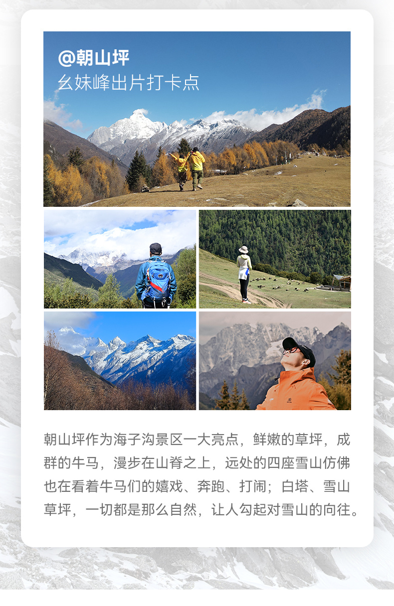 9.如是拼车到达四姑娘山镇,那么在没有特殊情况下也是拼车回成都;如是统一乘坐的公司安排的旅游大巴,那么最晚回成都时间是下午17:00(没有特殊情况的前提),选择徒步下山的伙伴们请把控好时间,如有特殊情况请提前与当团领队或者向导/客服说明情况;