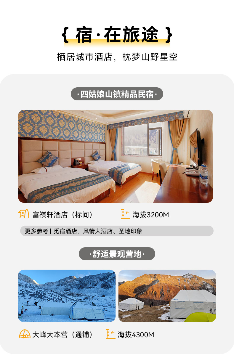 2.住宿:按行程所列标准入住。(其中:①活动第一晚四姑娘山镇酒店住宿); ②大本营通铺一晚 )
