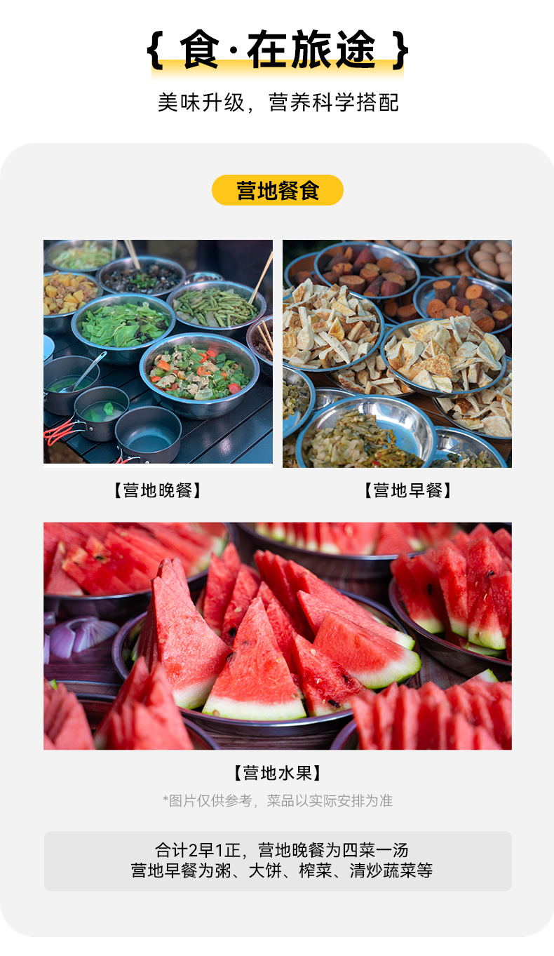 3.餐食:全程所列餐食合计1正2早,包含营地早餐、晚餐。营地晚餐为四菜一汤,营地早餐为粥、大饼、榨菜、清炒蔬菜等。