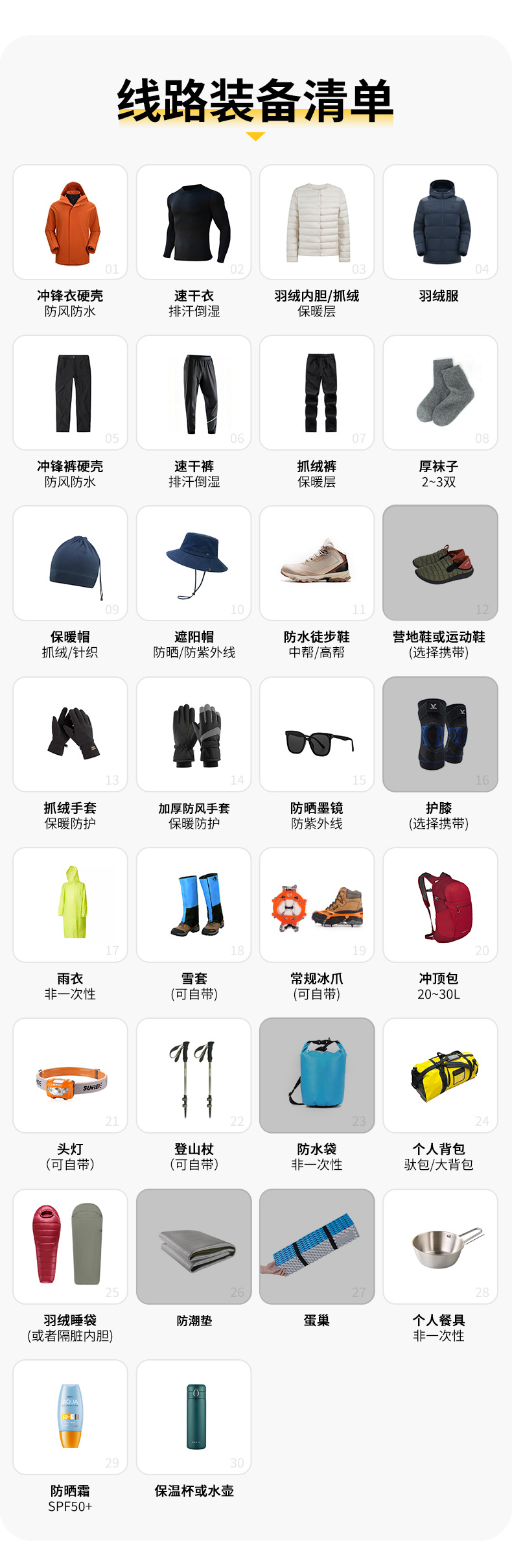 7.装备:燃料、炊具、部分餐具、通讯工具等。