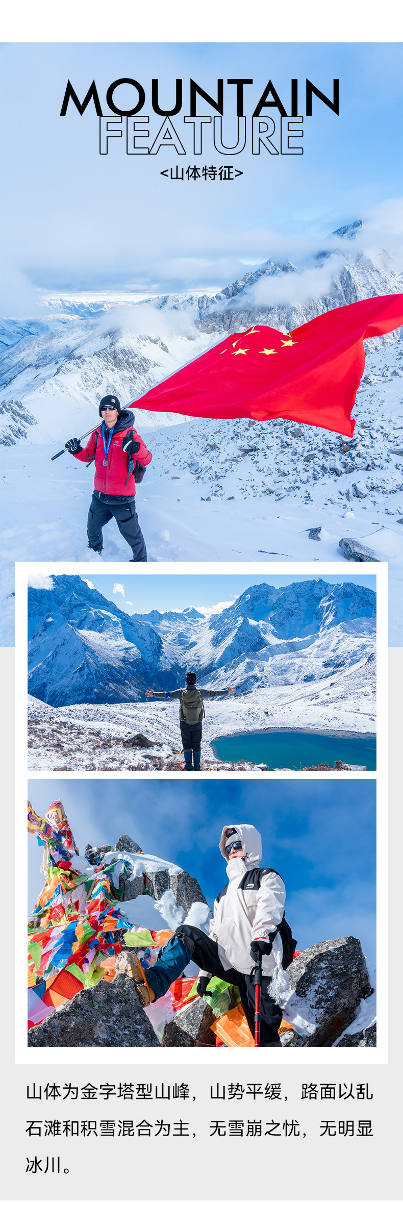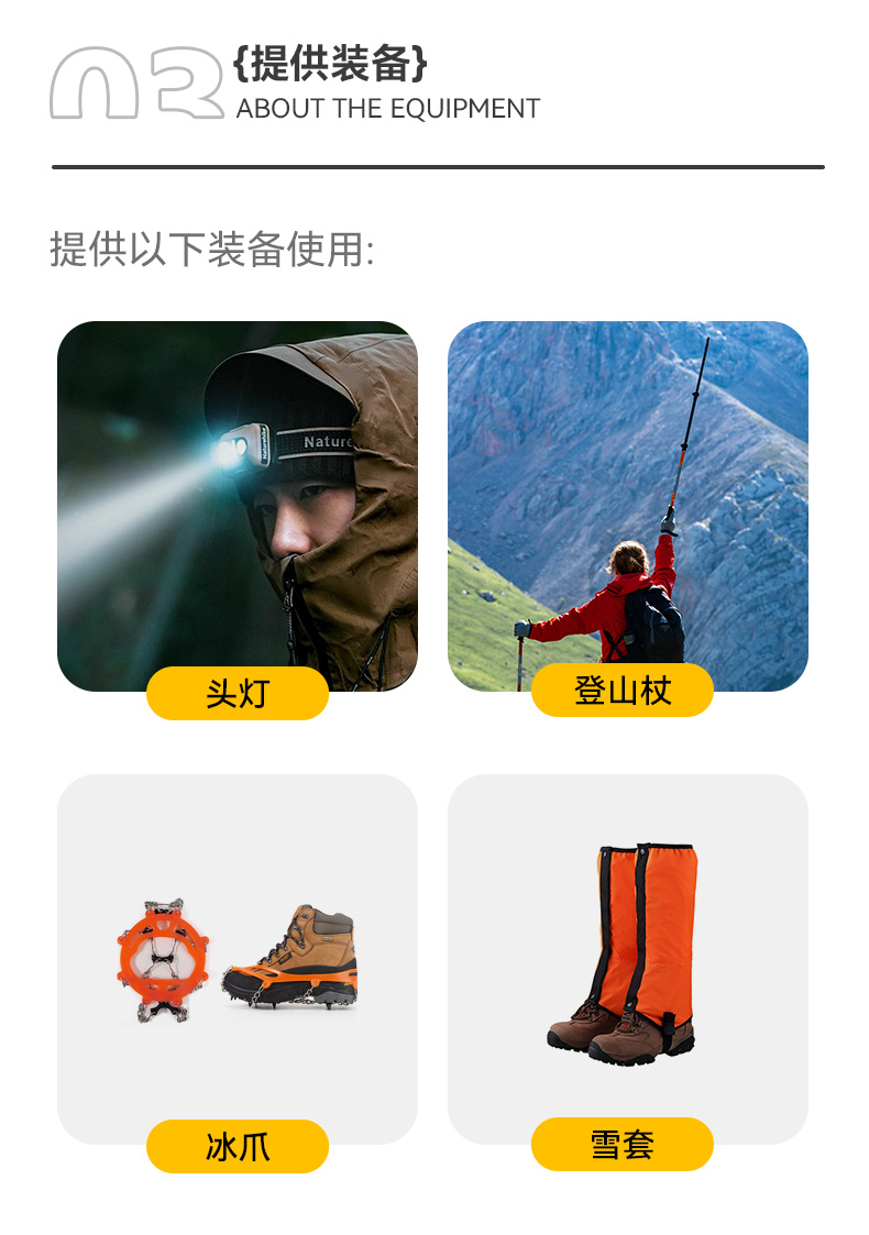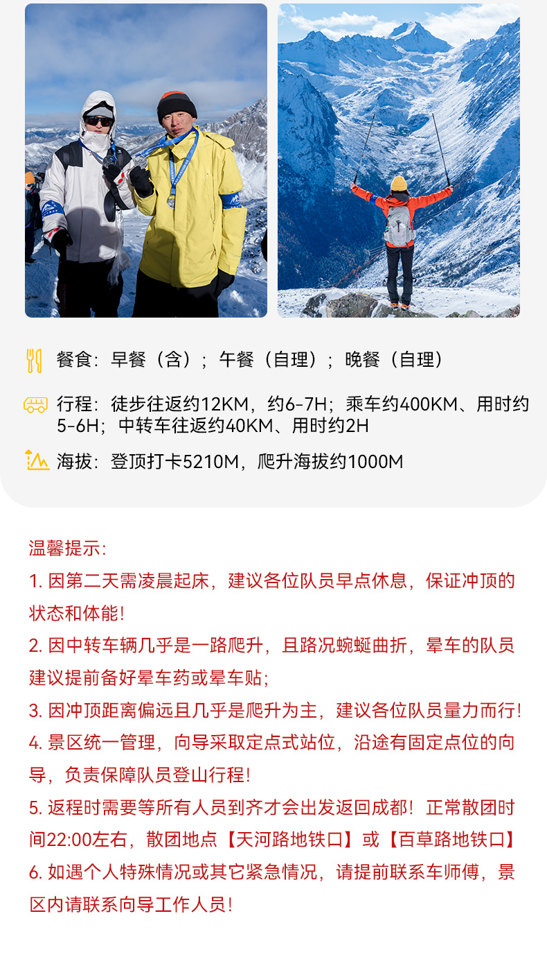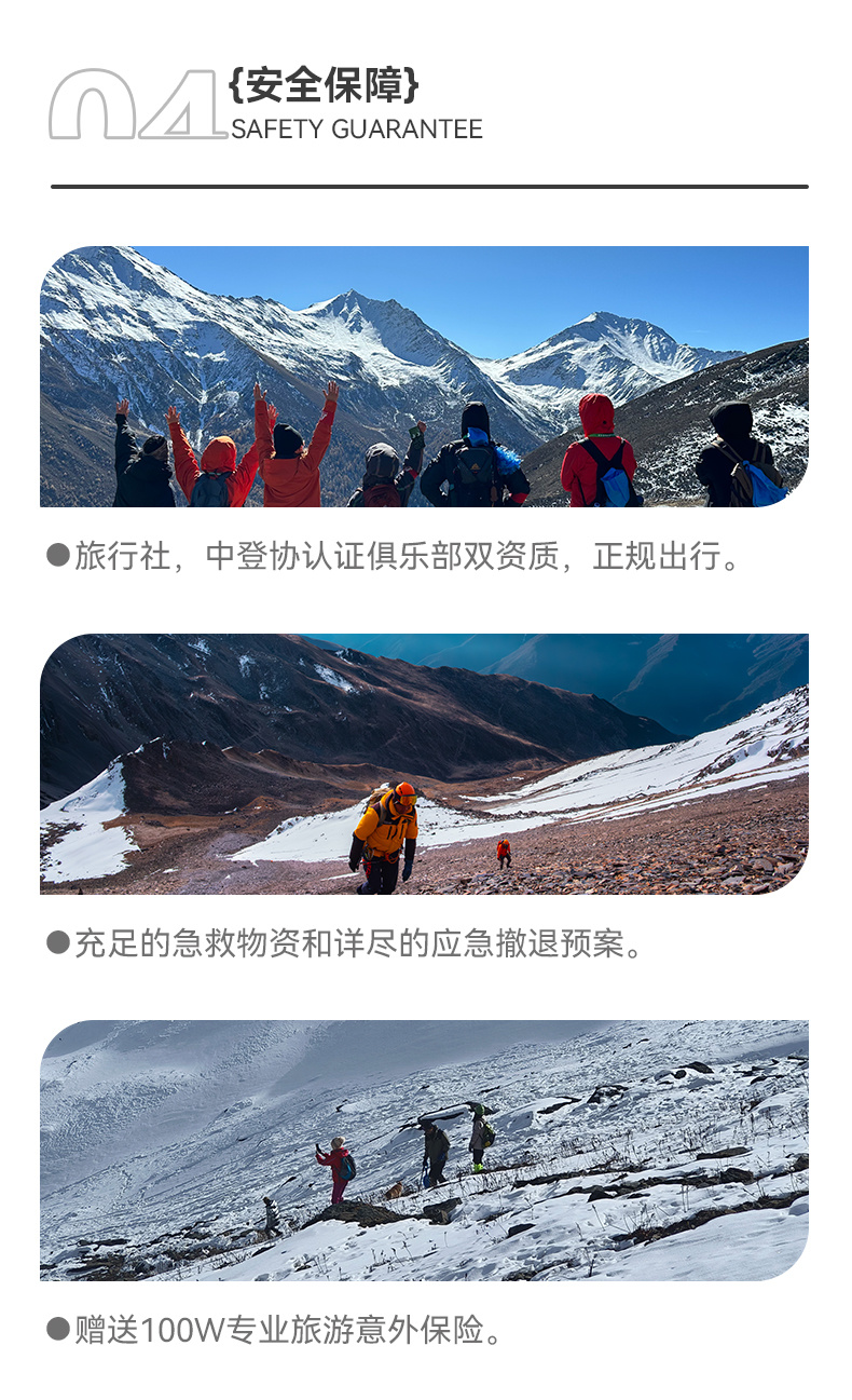 关于向导比的说明:作为三奥雪山景区安全生产主体责任单位,我方切实承担户外爱好者的安全保障义务,将根据攀登线路的承载量、天气因素综合考量。向导协作统一采用固定点位站岗+随队保障+救援队巡逻的形式,因此不再以传统的“1:N”形式安排向导。