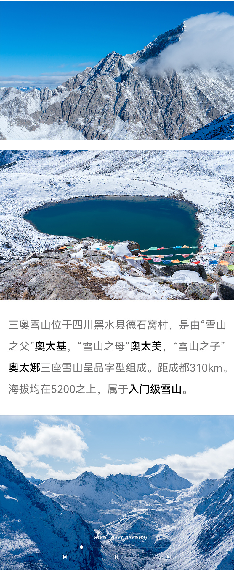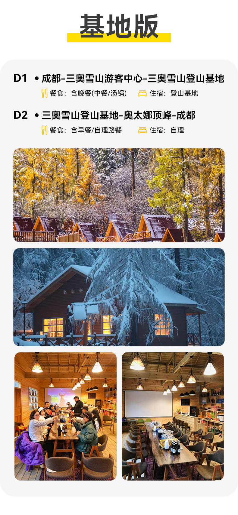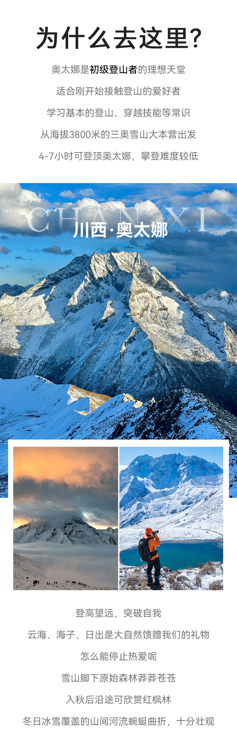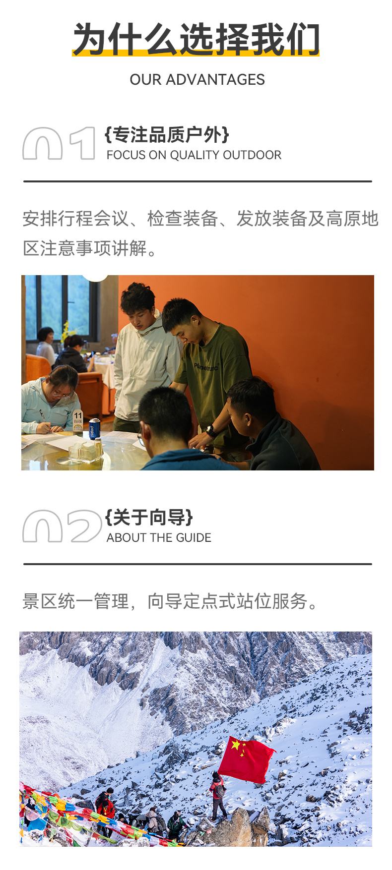 关于向导比的说明:作为三奥雪山景区安全生产主体责任单位,我方切实承担户外爱好者的安全保障义务,将根据攀登线路的承载量、天气因素综合考量。向导协作统一采用固定点位站岗+随队保障+救援队巡逻的形式,因此不再以传统的“1:N”形式安排向导。
