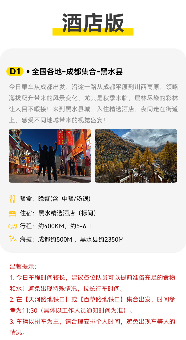 1.成都出发黑水县,集合时间大概11:00左右,具体以工作人员通知为准,错过大巴车出发时间,需自费拼车前往。