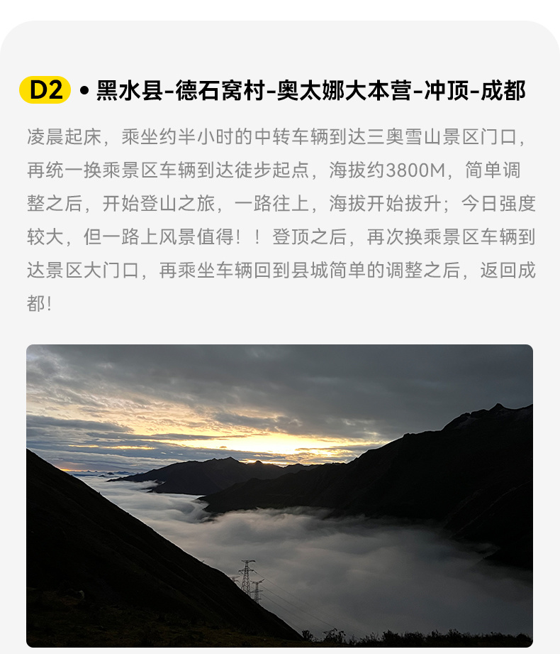 2.黑水县和奥太娜大本营返程需要等待人员齐全才能出发,所以不管提前下来多久,都需要等待大部队一起出发。出于安全考虑,大部队将15:00左右出发(以师傅通知为准),晚到的客人需要自费拼车回成都。