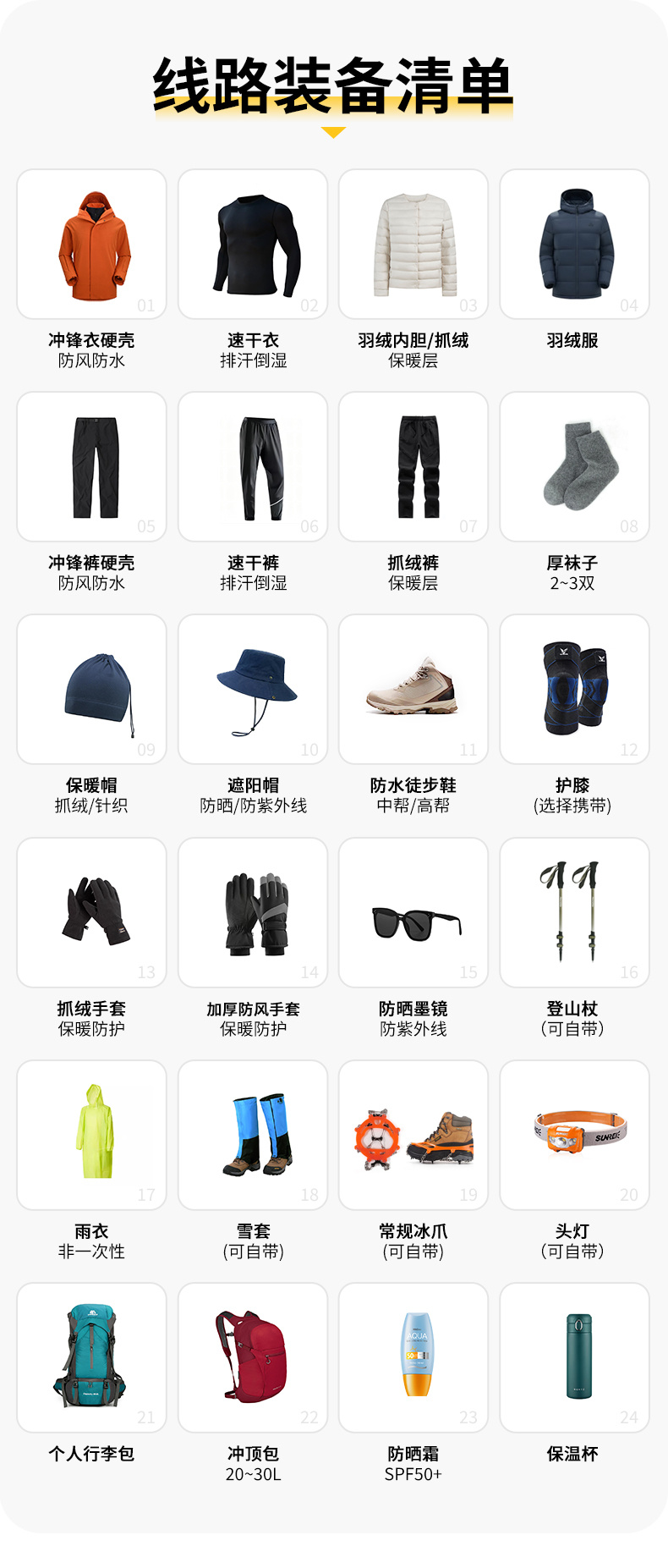 2、冲锋衣裤,排汗内衣裤,羽绒服,保暖内衣裤,高帮登山鞋、保暖排汗袜、保暖帽。