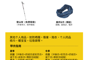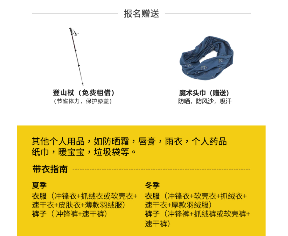 装备:登山杖1根(免费租借)、一次性雨衣1件(仅雨季提供)、魔术头巾1条;
