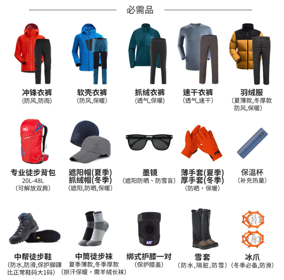 3.雨崩早晚比较冷,需准备手套、帽子、透气保暖内衣、加绒冲锋衣,冲锋裤,一件羽绒服备用,徒步过程中可能会比较热,需备速干衣。
