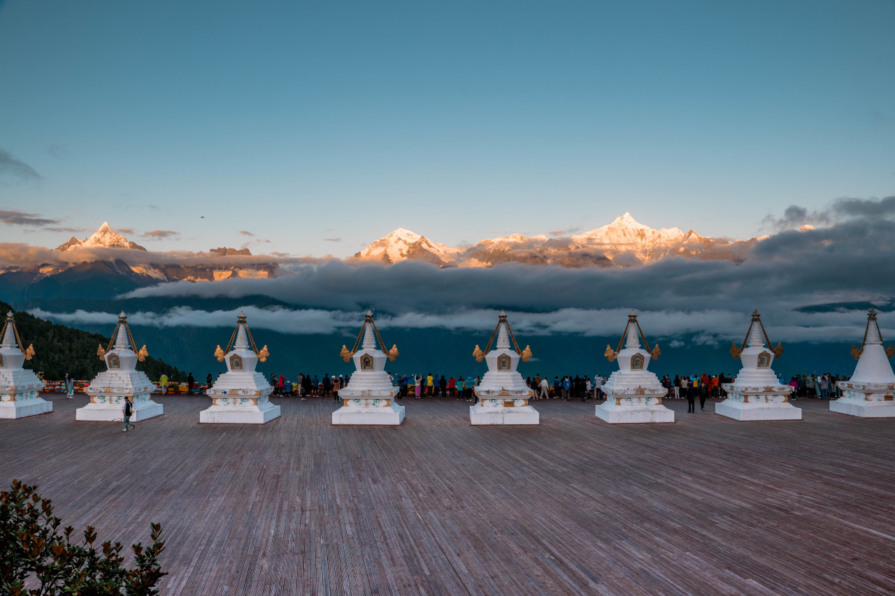然后继续往前行驶,傍晚来临之际我们将到达酒店,傍晚可到飞来寺观景台观看梅里雪山,近距离感受这座神圣的雪山。天气较好的时候可一睹梅里雪山的绚烂晚霞,当整个霞光铺满雪山的上空,那一刻的震撼是此生都不会再见到的。