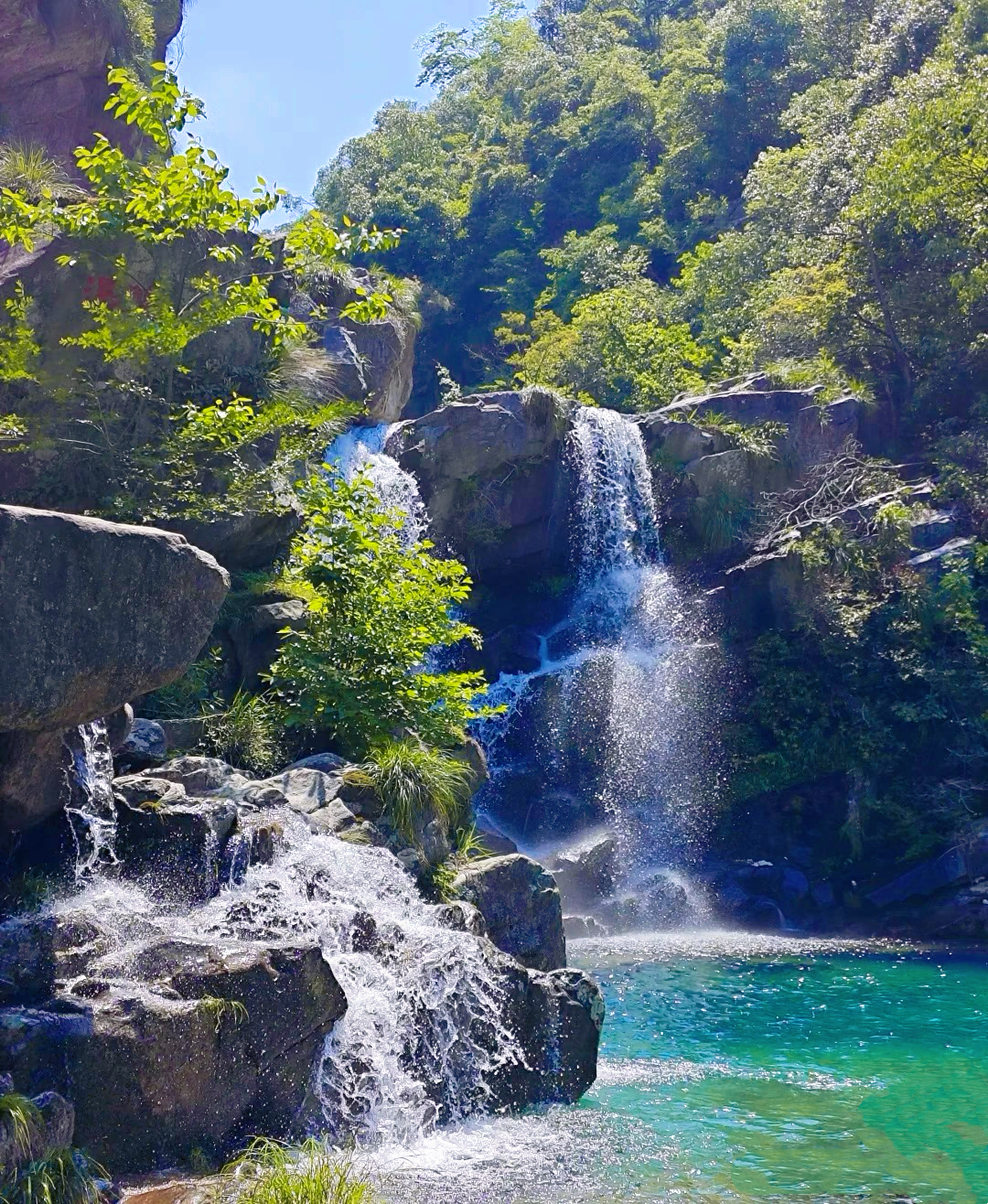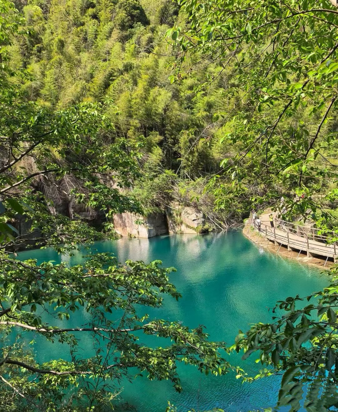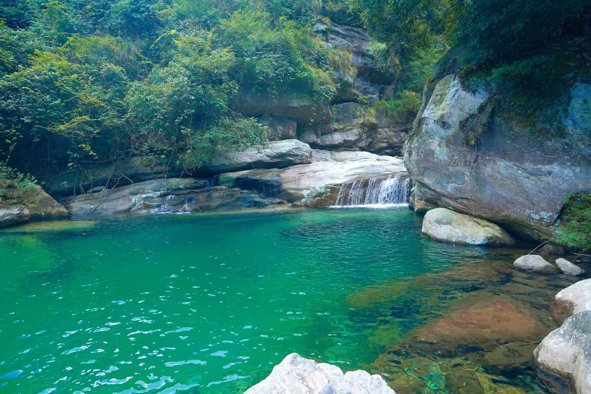 碧龙潭景区位于江西省九江市庐山市牯岭镇小天池东北面,是庐山自然风光中的精华,号称庐山“第一瀑”,有“山北绝胜”之称。景区以250万年前的第四纪冰川遗迹和丰富的历史人文景观及自然景观相融而成,全长约2000余米,沿途风光秀丽,植被茂盛,怪石嶙峋,奇峰峥嵘。景区内有飘然直泻的一线泉、鬼斧神工的仙人池等自然景点,以及碧龙潭瀑布等30多处景观。潭水清澈纯净,颜色绝美,部分水潭宽阔深邃,水面平静如镜,倒映着蓝天白云和周围山峦,宛如九寨沟的梦幻世界,特别适合徒步爱好者游玩。