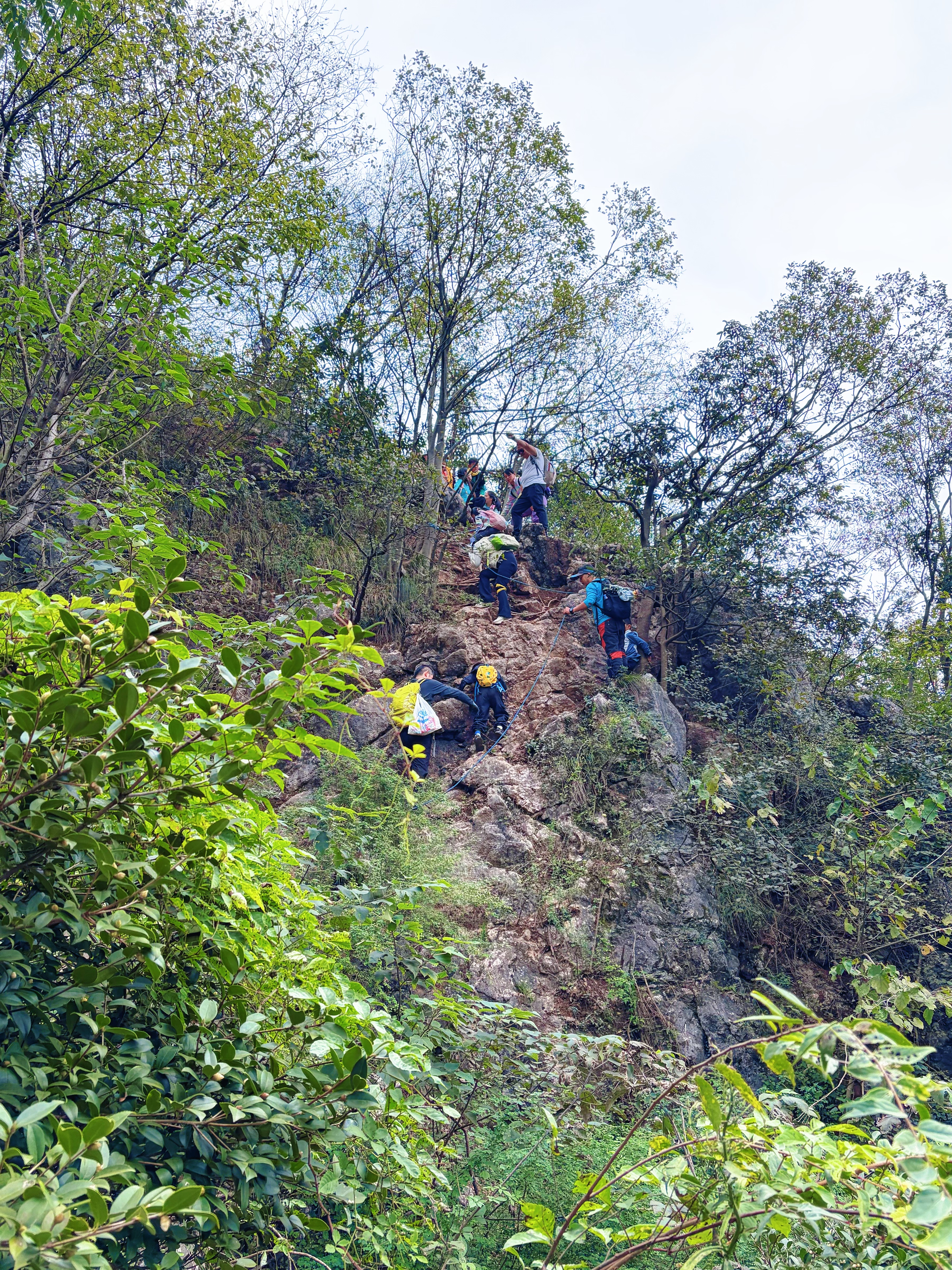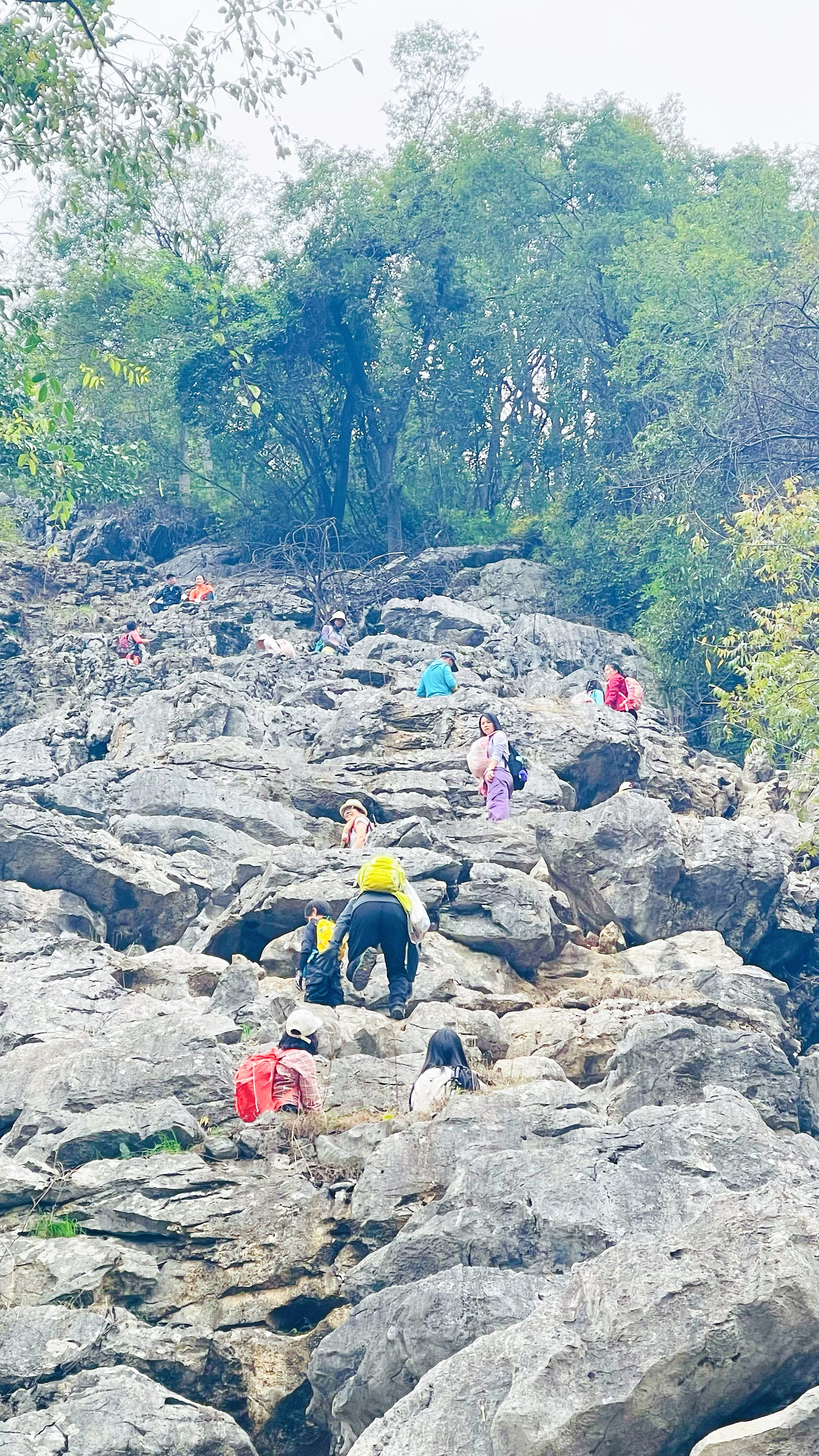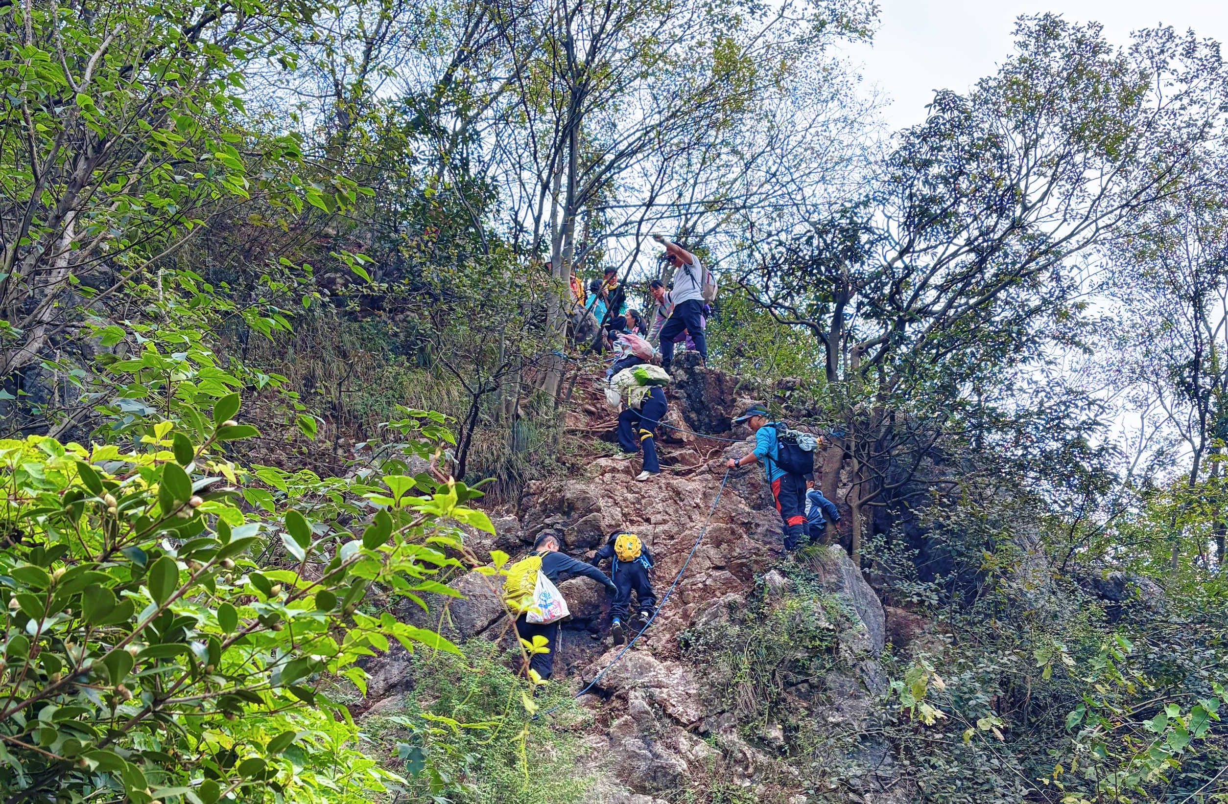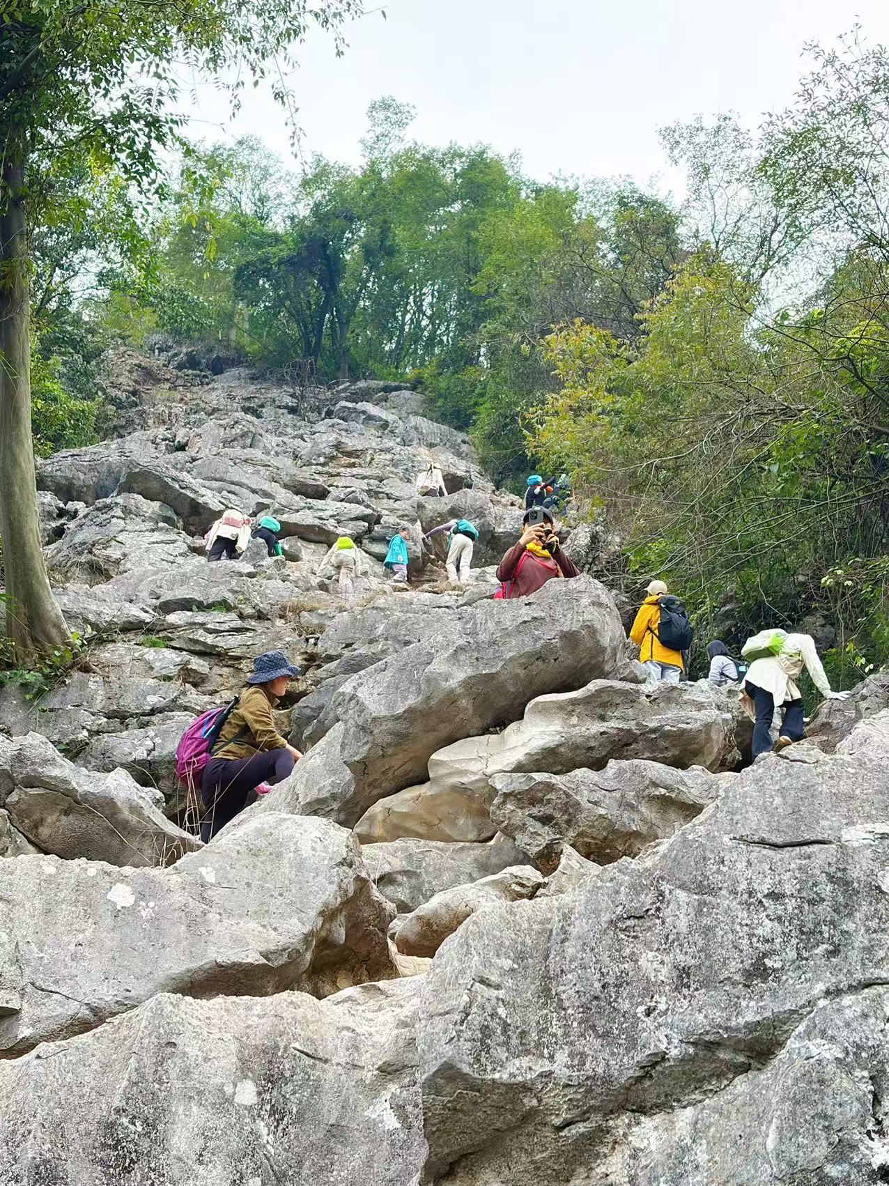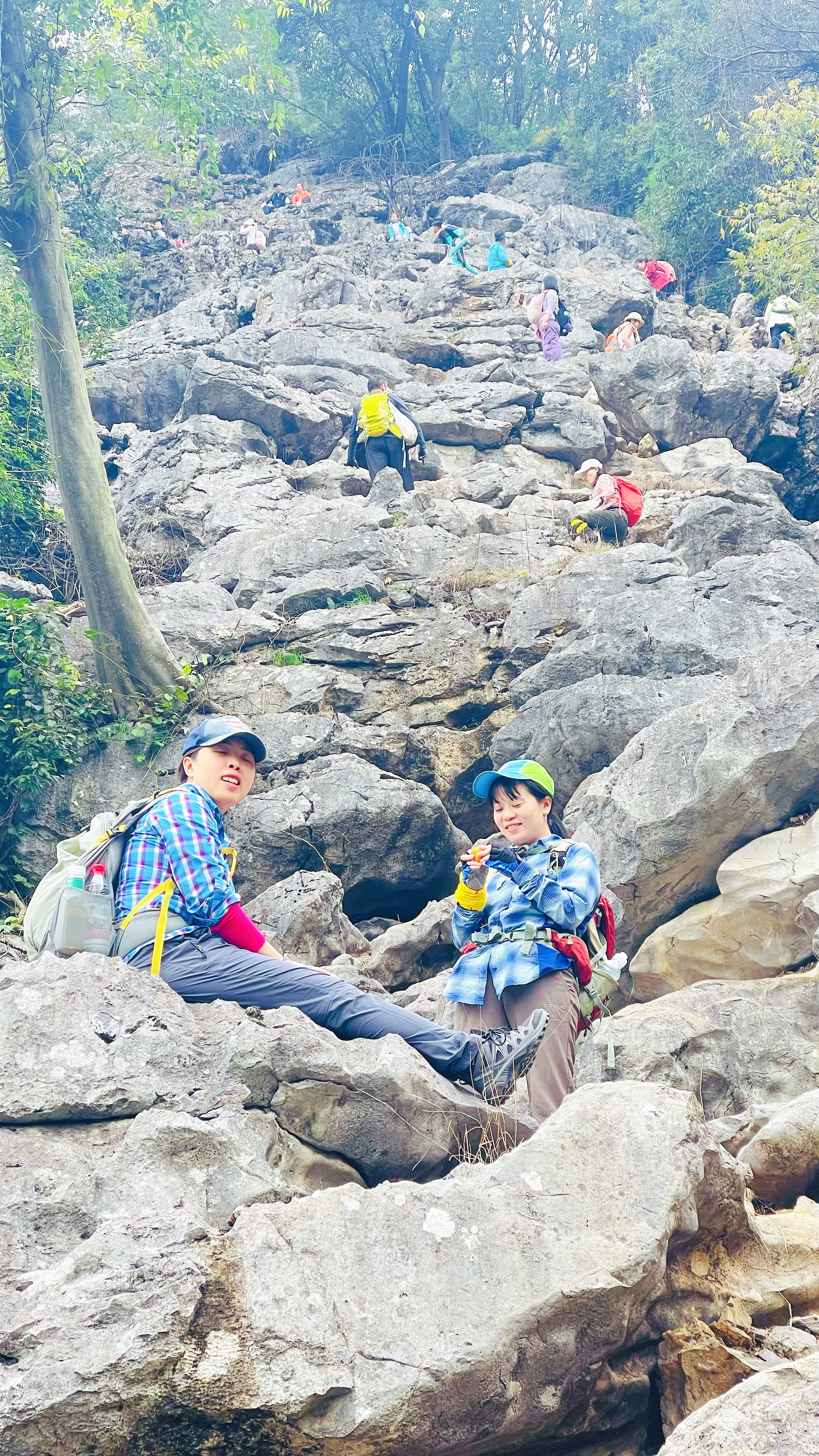 【线路简介】全程约10公里。最高海拔549米,累计爬升673米,运动时长约6小时左右,全程最精华路段,就是喀斯特地貌岩石攀爬,远看山体为垂直,其实走近确实很好攀爬的岩体,攀爬海拔高度约200米,耗时约40分钟,非常适合拍照打卡,小朋友就喜欢这种攀爬,可以锻炼协调能力等