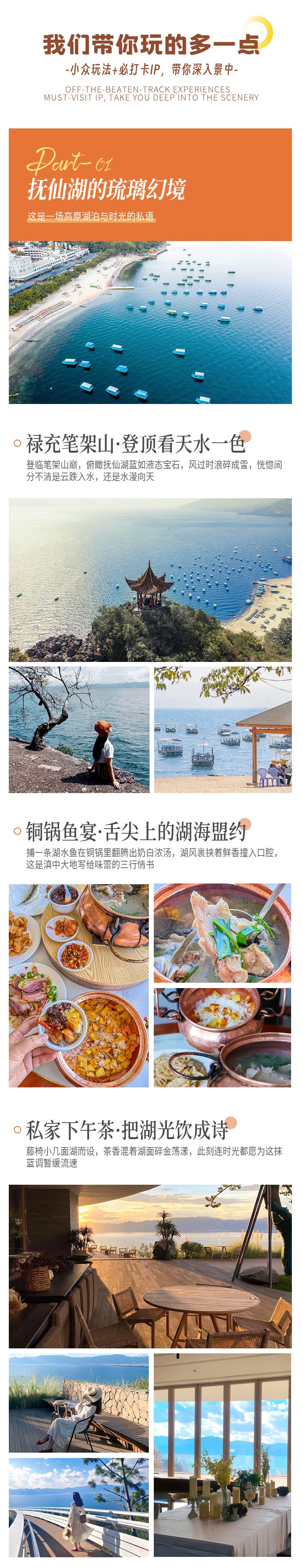 09:30 抵达【抚仙湖】。这是中国蓄水量最大的淡水湖泊,未受污染的湖水清澈见底,高原的微风吹起碧波万顷。我们将前往精华的【禄充景区】,在这儿沙滩漫步,登笔架山俯瞰抚仙湖(笔架山为台阶路,较平缓,步行约20分钟即可登顶,轻松休闲,老少皆宜)。
