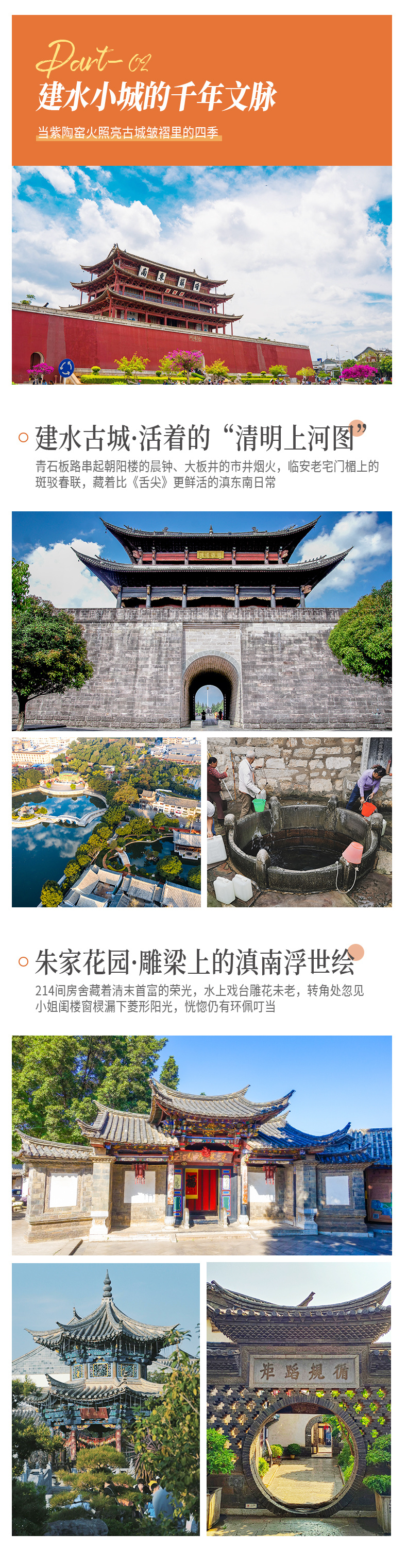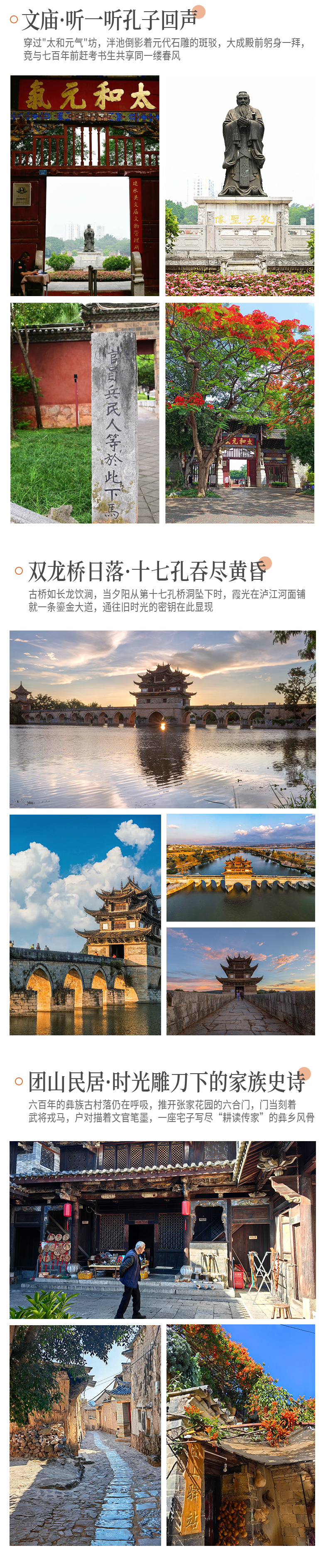 4、门票:抚仙湖禄充景区,下午茶,建水文庙,朱家花园,团山民居,元阳景区,阿者科民俗村,东风韵景区;