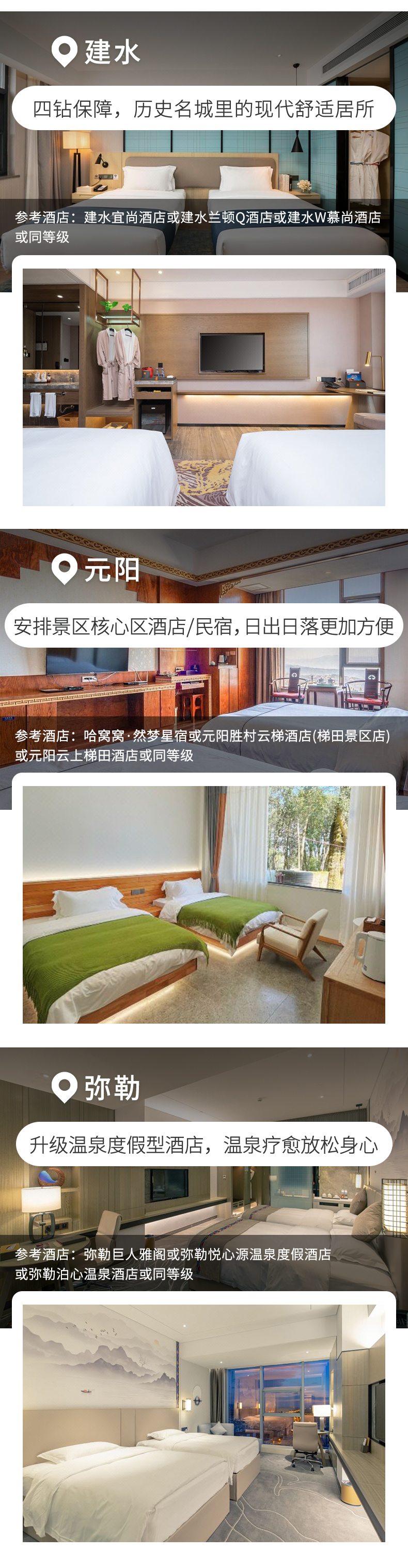 1、住宿:昆明四钻酒店1晚(参考:龚禧里·禧见酒店或枫渡酒店(昆明站官渡万象城店)或同等级酒店),建水四钻酒店1晚(参考:建水宜尚酒店或建水兰顿Q酒店或建水W慕尚酒店或同等级酒店),元阳三钻民宿或四钻酒店1晚(参考:元阳胜村云梯酒店(梯田景区店)或哈窝窝·然梦星宿或同等级民宿/酒店),弥勒四钻酒店1晚(参考:弥勒巨人雅阁酒店或弥勒悦心源温泉度假酒店或弥勒泊心温泉酒店或同等级酒店);