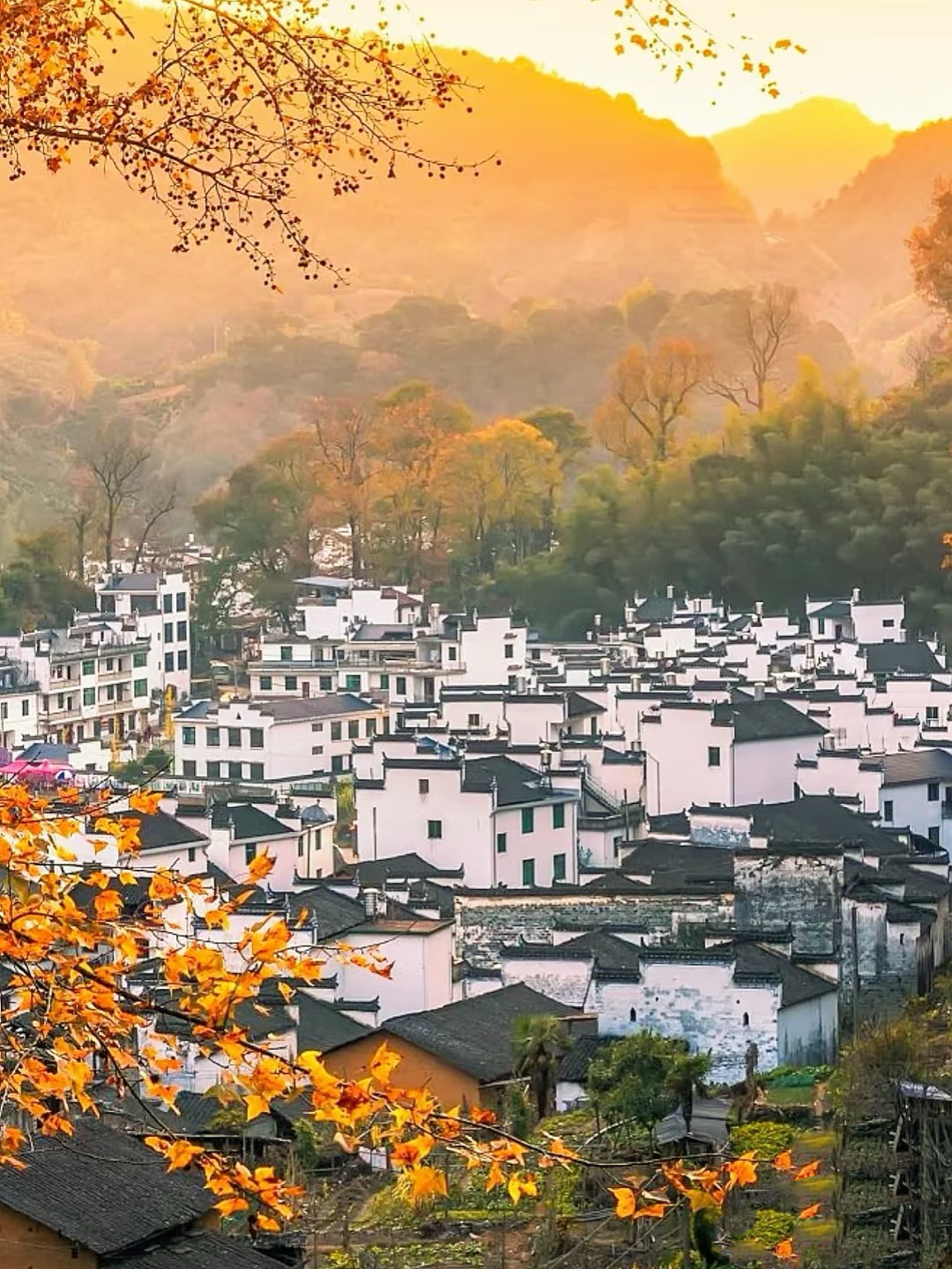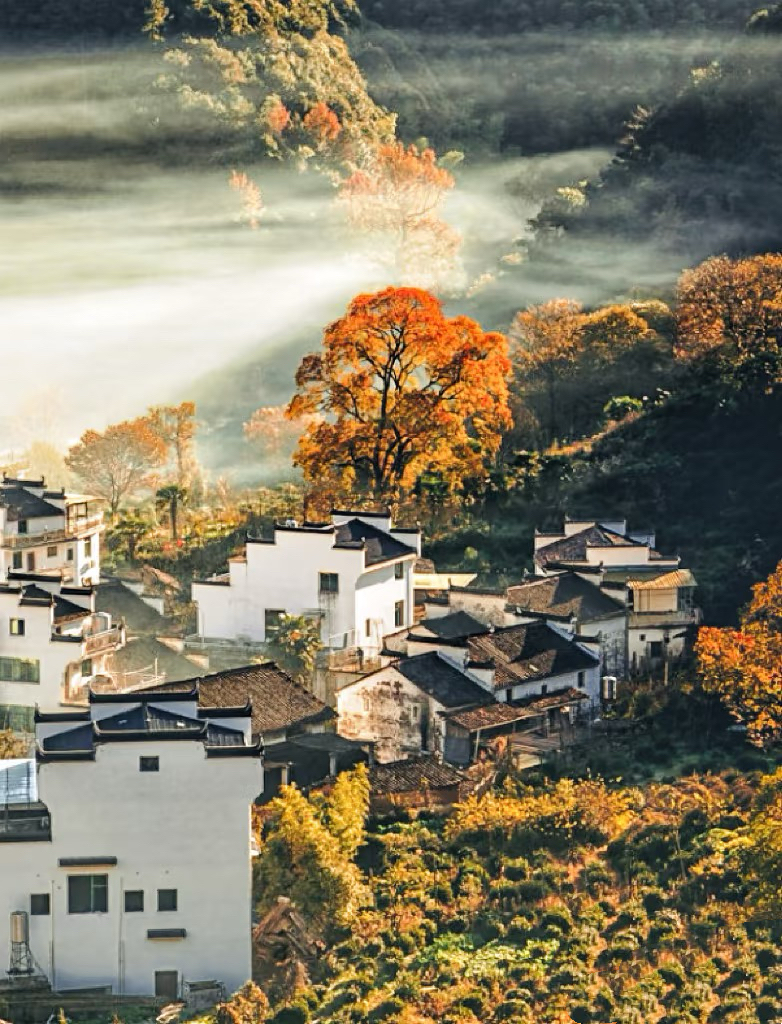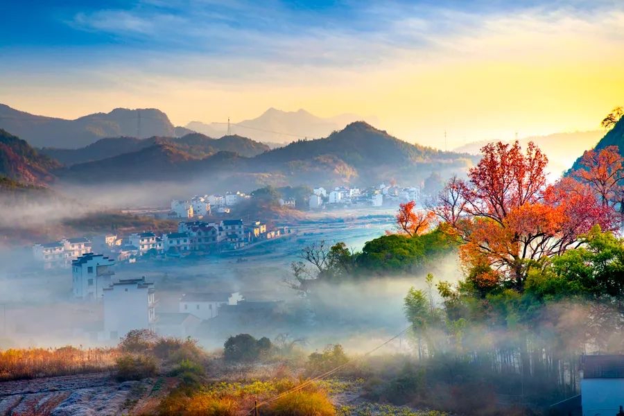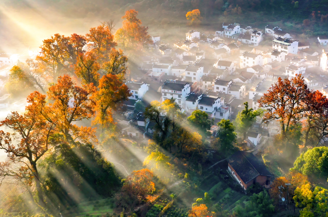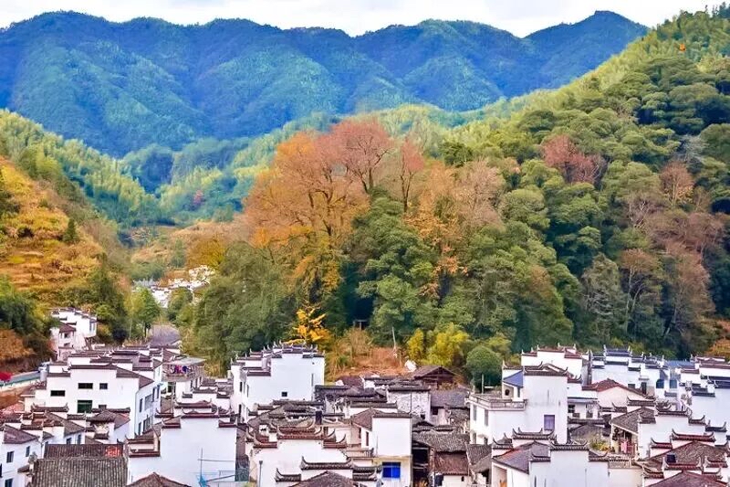 五颜六色的树叶与远山、近水、粉墙、黛瓦相映成趣,构成一幅天人合一的画卷。婺源江岭山谷中的村落房前屋后,白墙黑瓦与秋色互相映衬,仿佛就是从画中走出来的美丽古村。
