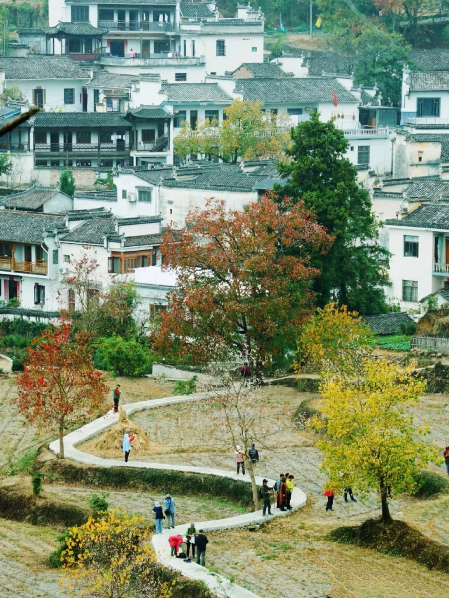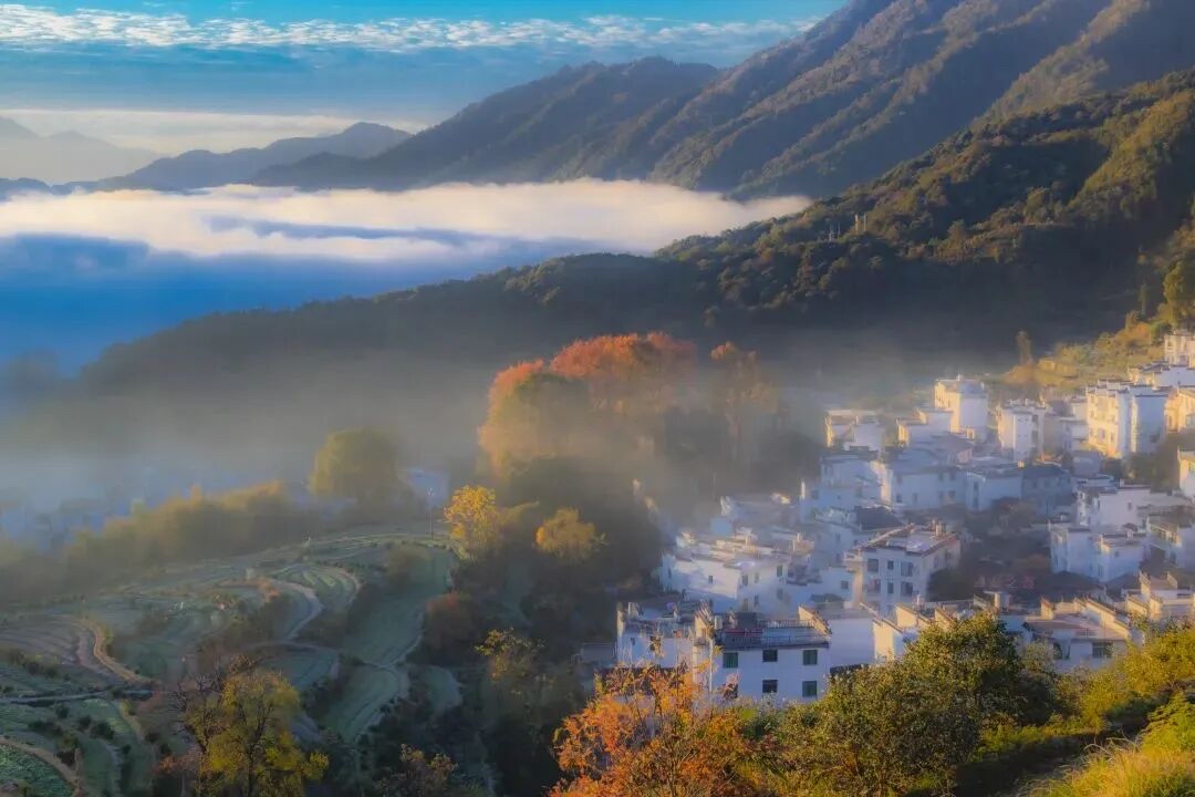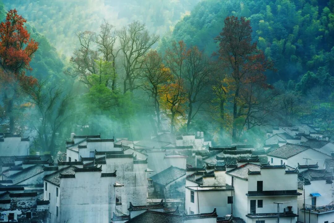 五颜六色的树叶与远山、近水、粉墙、黛瓦相映成趣,构成一幅天人合一的画卷。婺源江岭山谷中的村落房前屋后,白墙黑瓦与秋色互相映衬,仿佛就是从画中走出来的美丽古村。