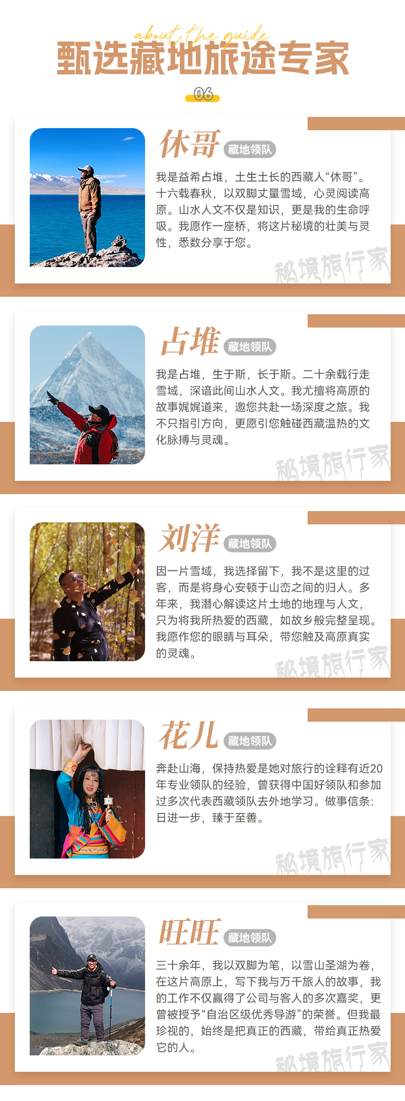 6、领队:领队交通,工资,食宿补贴。每车配备专业领队全程陪同,为大家讲解藏传佛教的文化、行程向导,并保证一团一证。