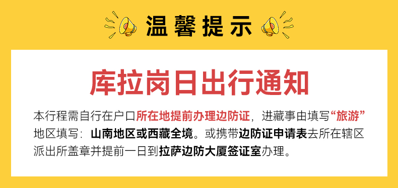 4、边防证办理费用:本行程需自行在户口所在地提前办理边防证,进藏事由填写“旅游”,地区填写:山南地区。或携带边防证申请表去所在辖区派出所盖章,并提前一日到拉萨边防大厦签证室办理。